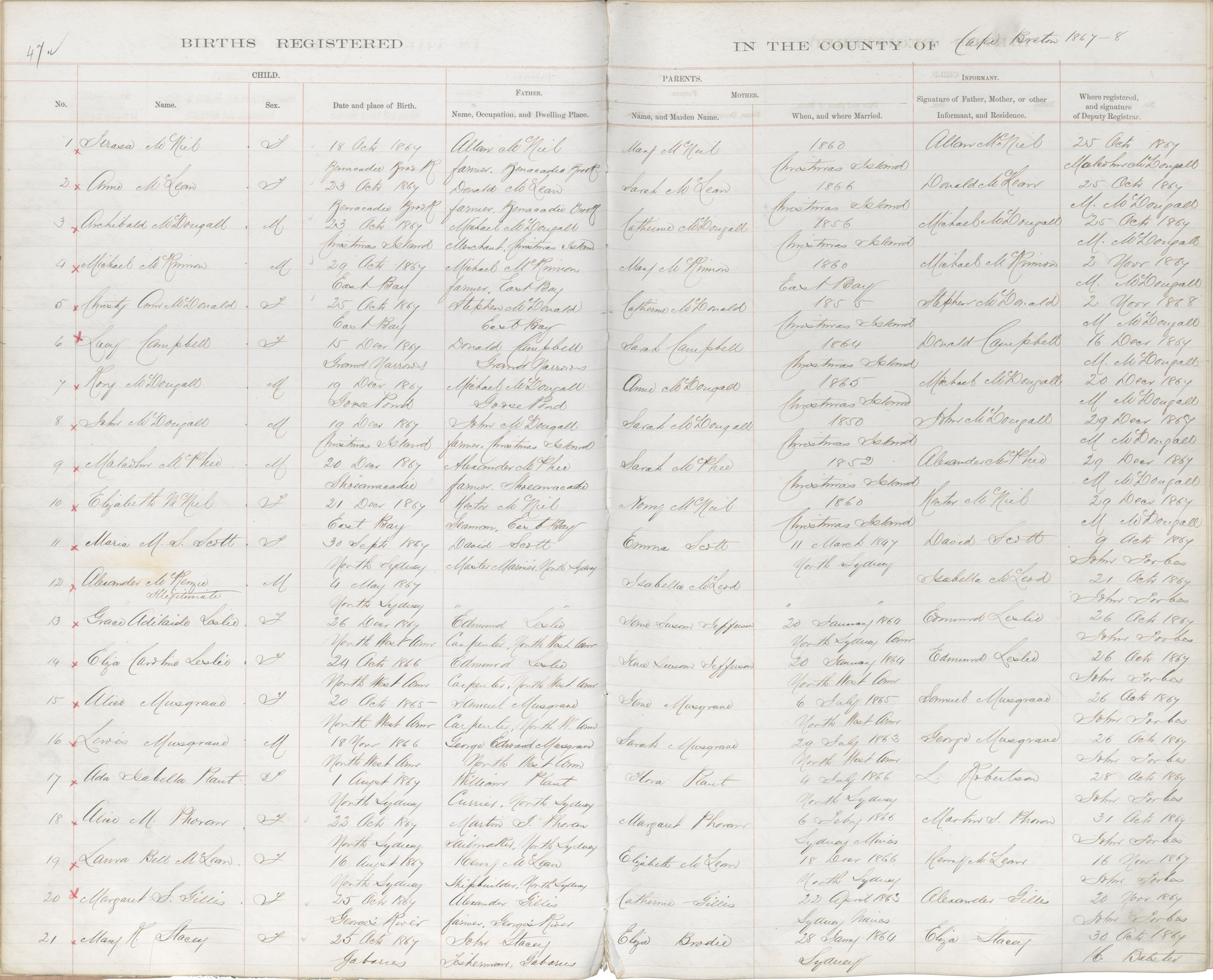 Female Birth Registration: Year: 1867 book: 1803 page: 47 number: 5