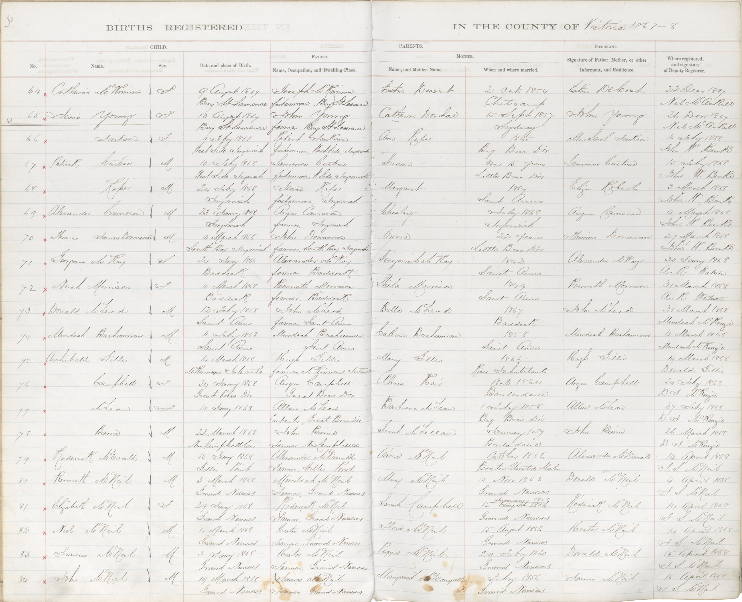Male Birth Registration: Year: 1868 book: 1822 page: 30 number: 79