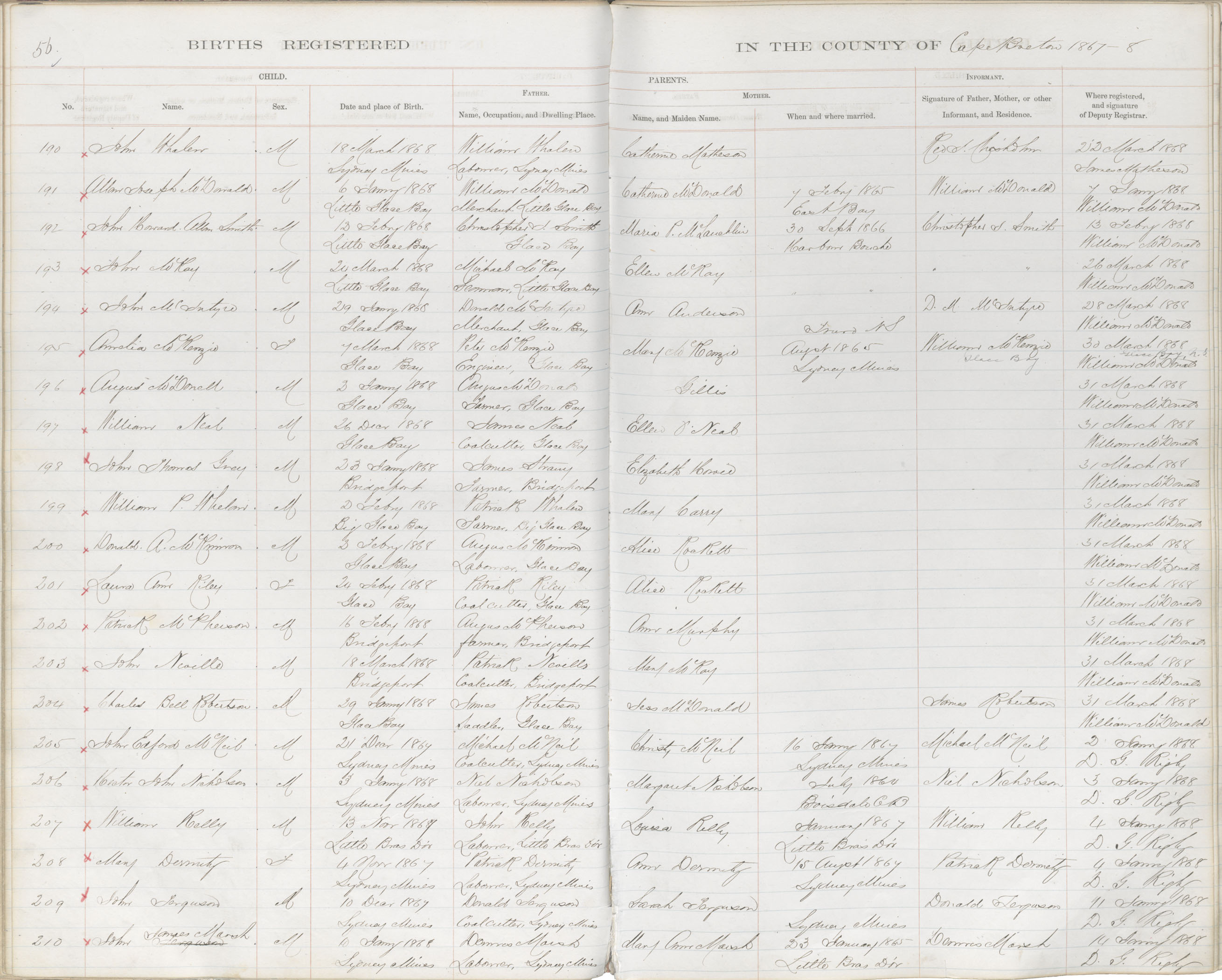 Male Birth Registration: Year: 1868 book: 1803 page: 56 number: 191