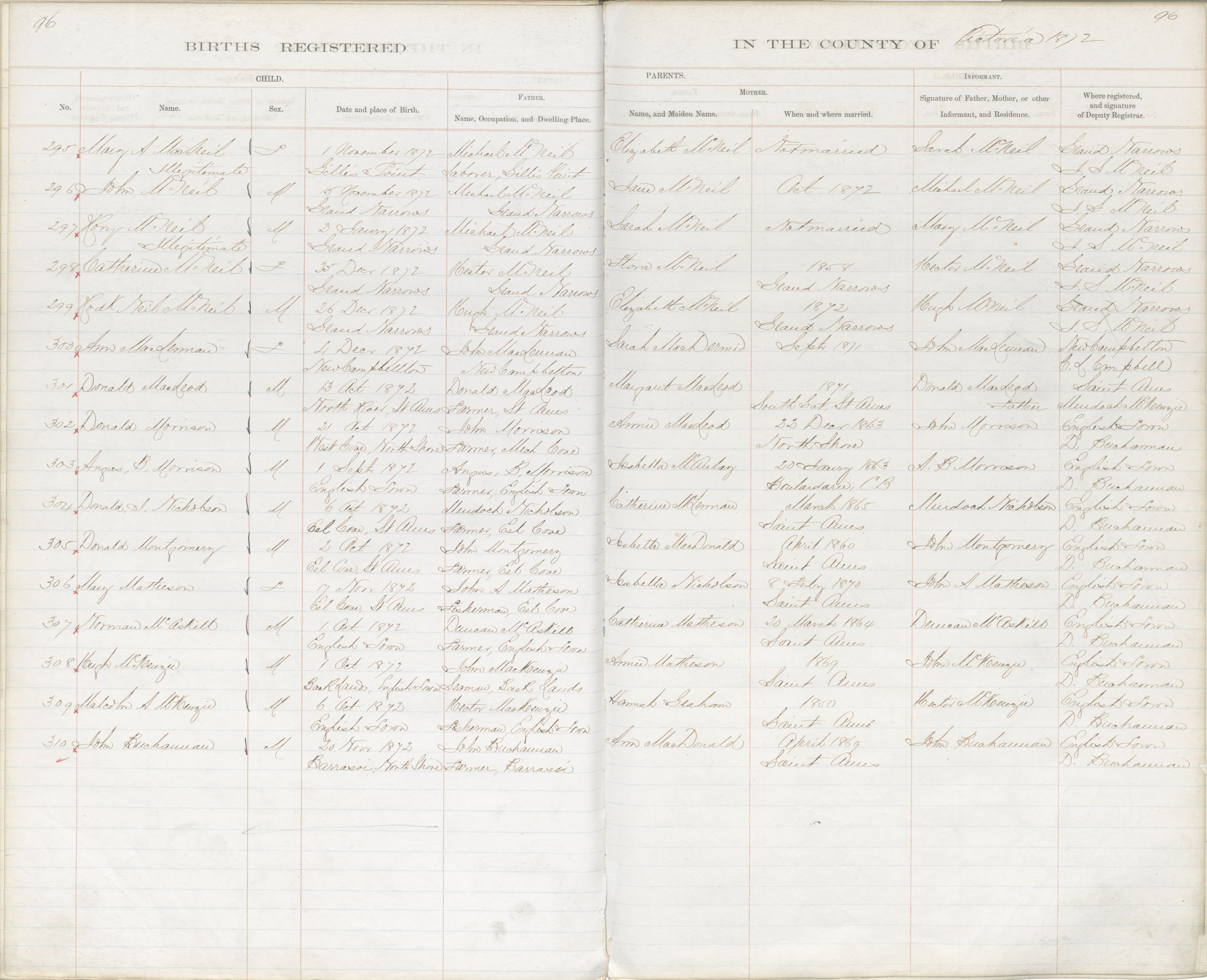 Male Birth Registration: Year: 1872 book: 1822 page: 96 number: 310