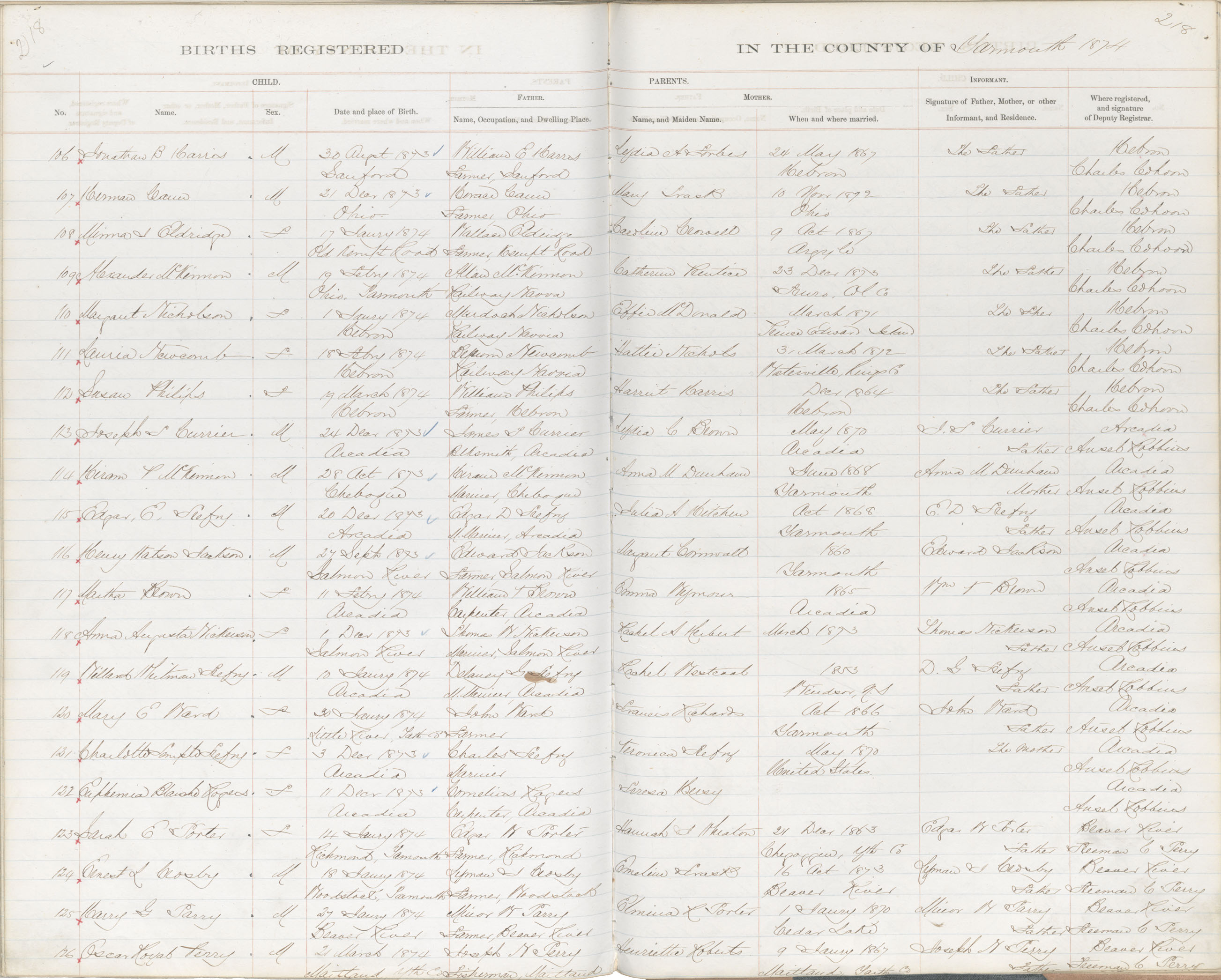 Birth Registration: Year: 1874 book: 1823 page: 218 number: 126