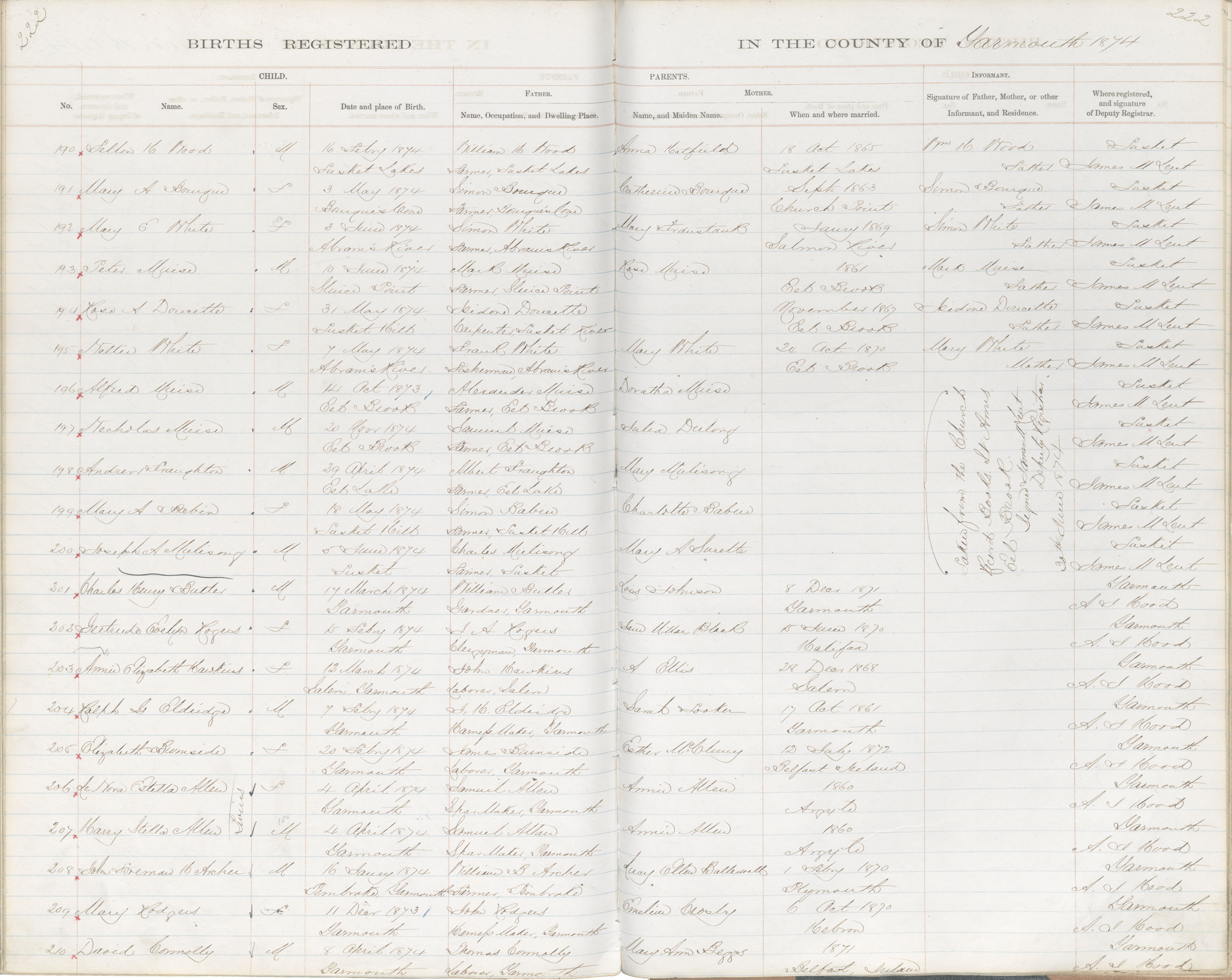 Birth Registration: Year: 1874 book: 1823 page: 222 number: 210