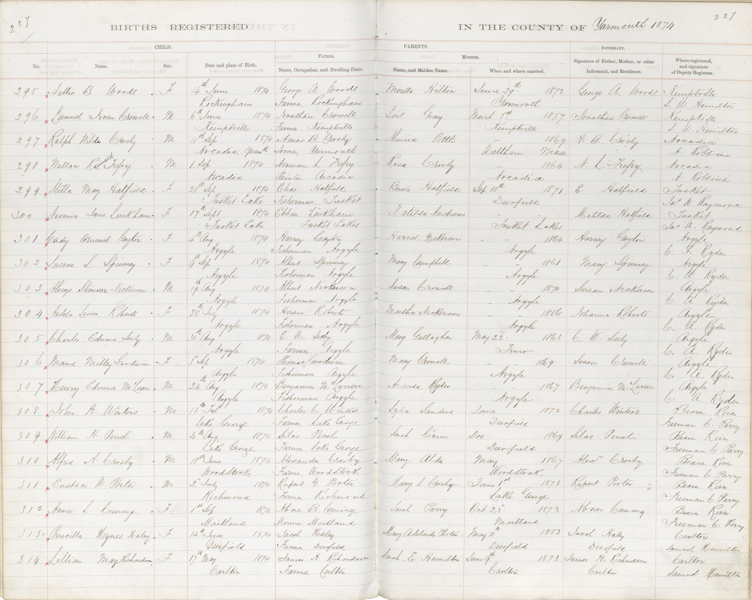 Female Birth Registration: Year: 1874 book: 1823 page: 227 number: 295