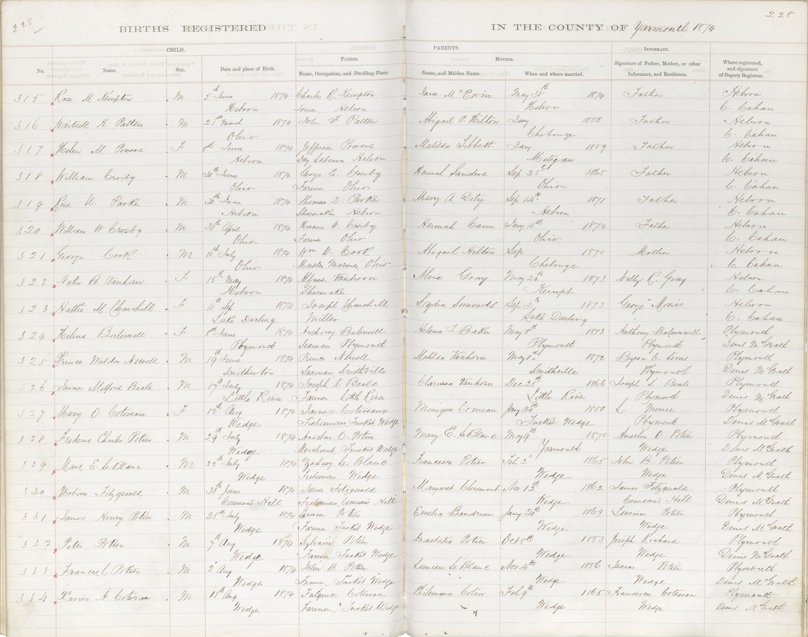 Female Birth Registration: Year: 1874 book: 1823 page: 228 number: 315
