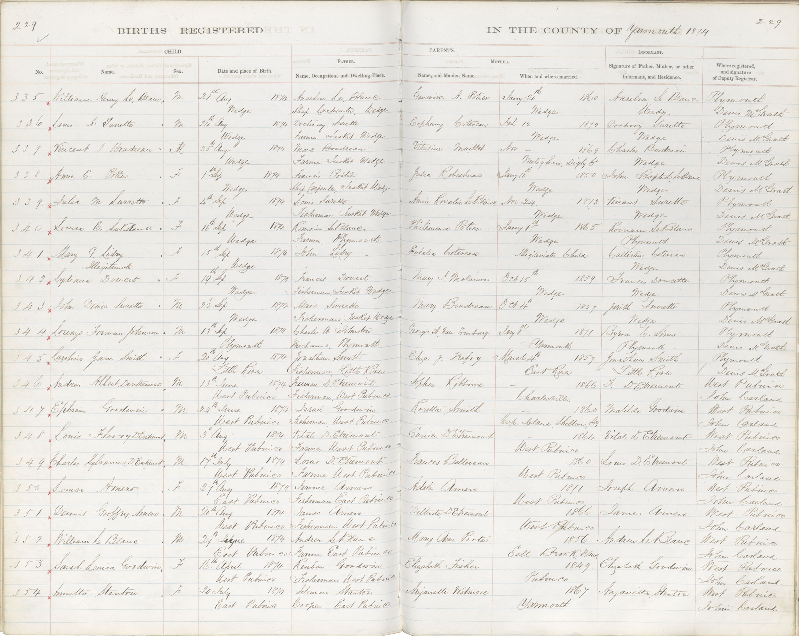 Birth Registration: Year: 1874 book: 1823 page: 229 number: 335
