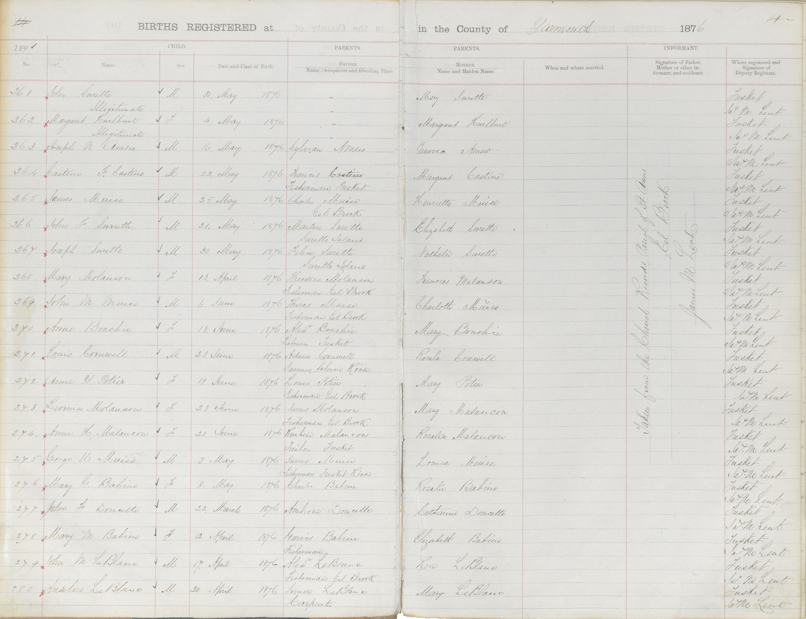 Male Birth Registration: Year: 1876 book: 1823 page: 284 number: 261