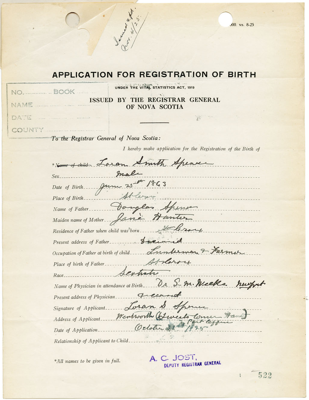 Male Birth Registration: Year: 1863 number: 93300522