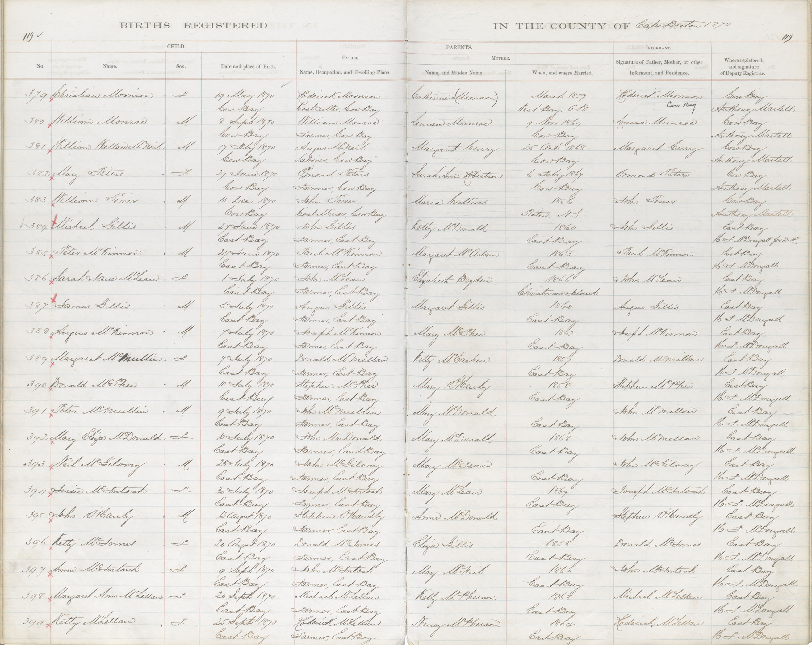 Female Birth Registration: Year: 1870 book: 1803 page: 119 number: 392