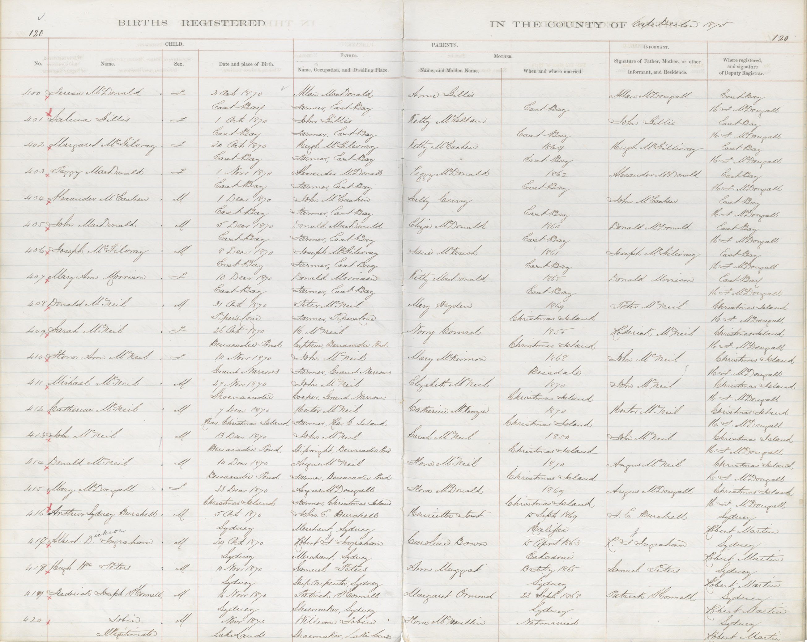 Male Birth Registration: Year: 1870 book: 1803 page: 120 number: 405