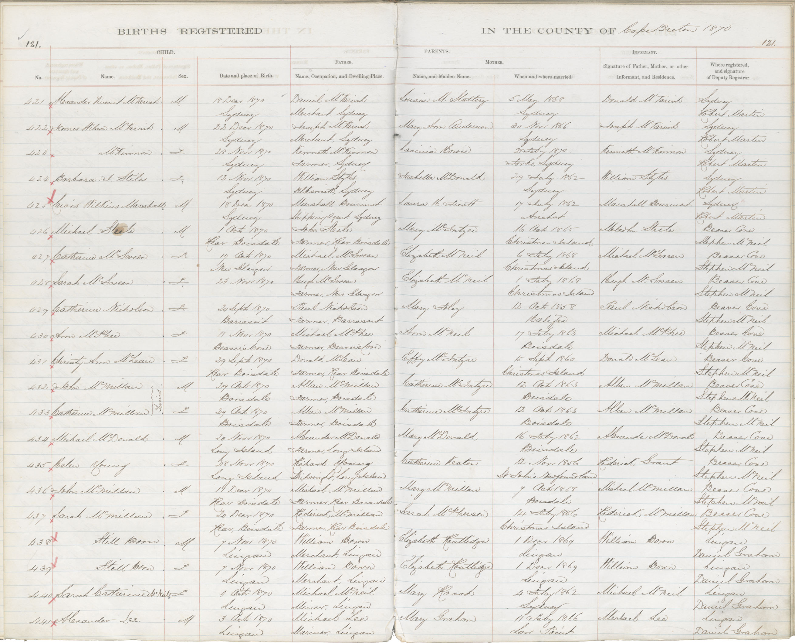 Male Birth Registration: Year: 1870 book: 1803 page: 121 number: 434