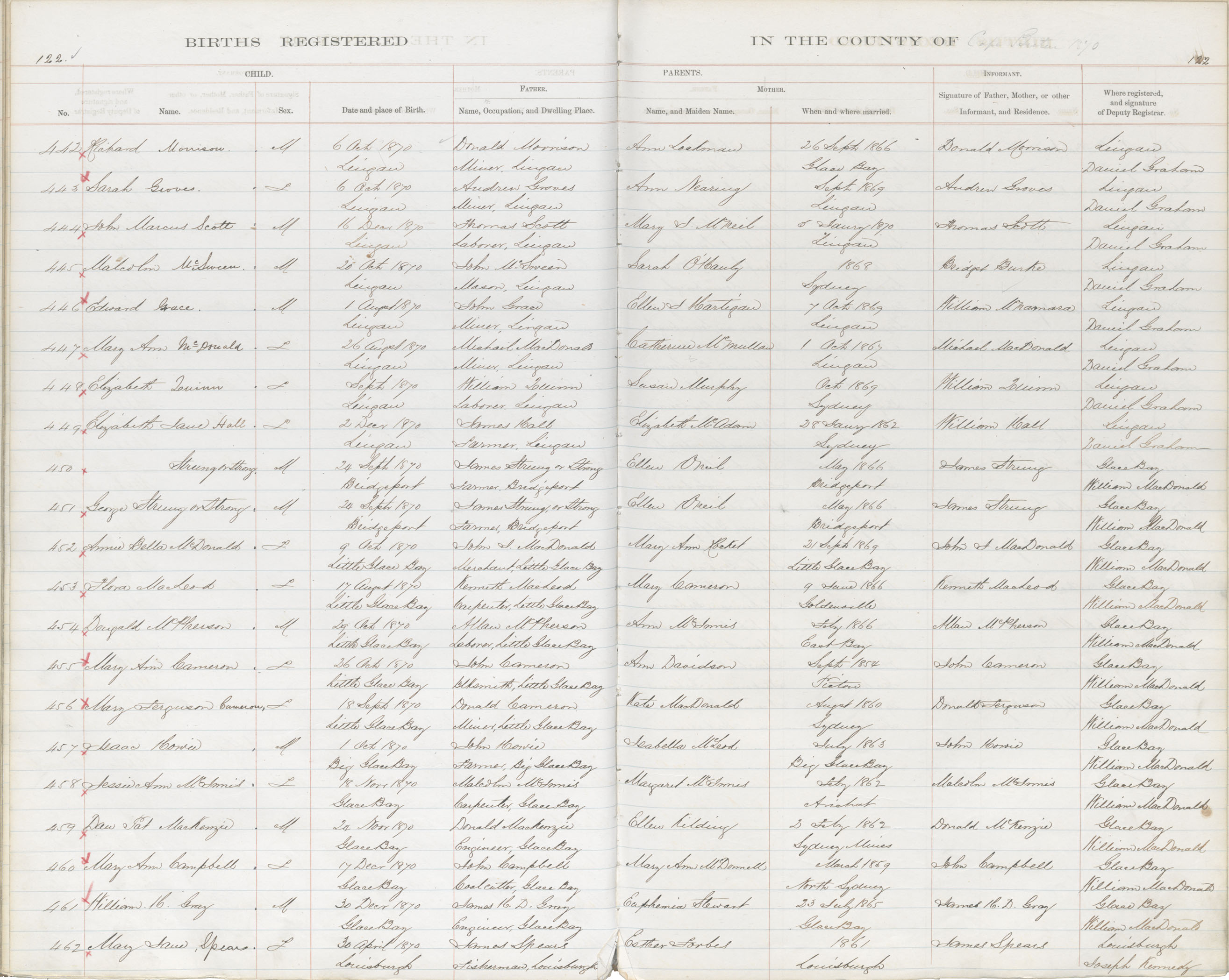 Female Birth Registration: Year: 1870 book: 1803 page: 122 number: 452