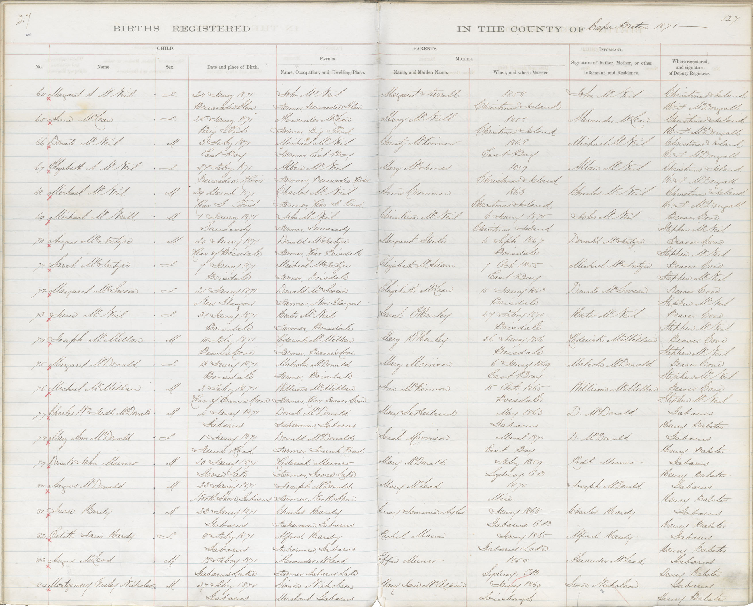 Male Birth Registration: Year: 1871 book: 1803 page: 127 number: 77