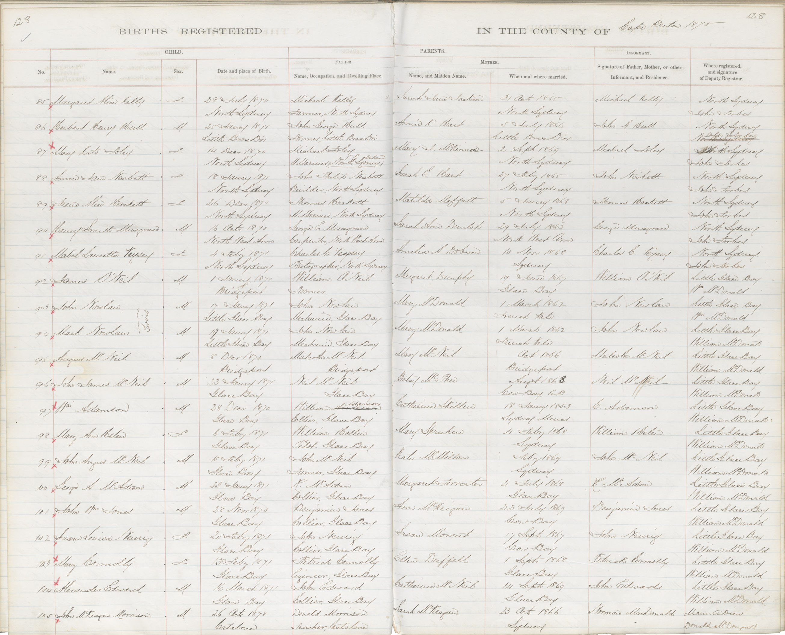 Male Birth Registration: Year: 1870 book: 1803 page: 128 number: 105