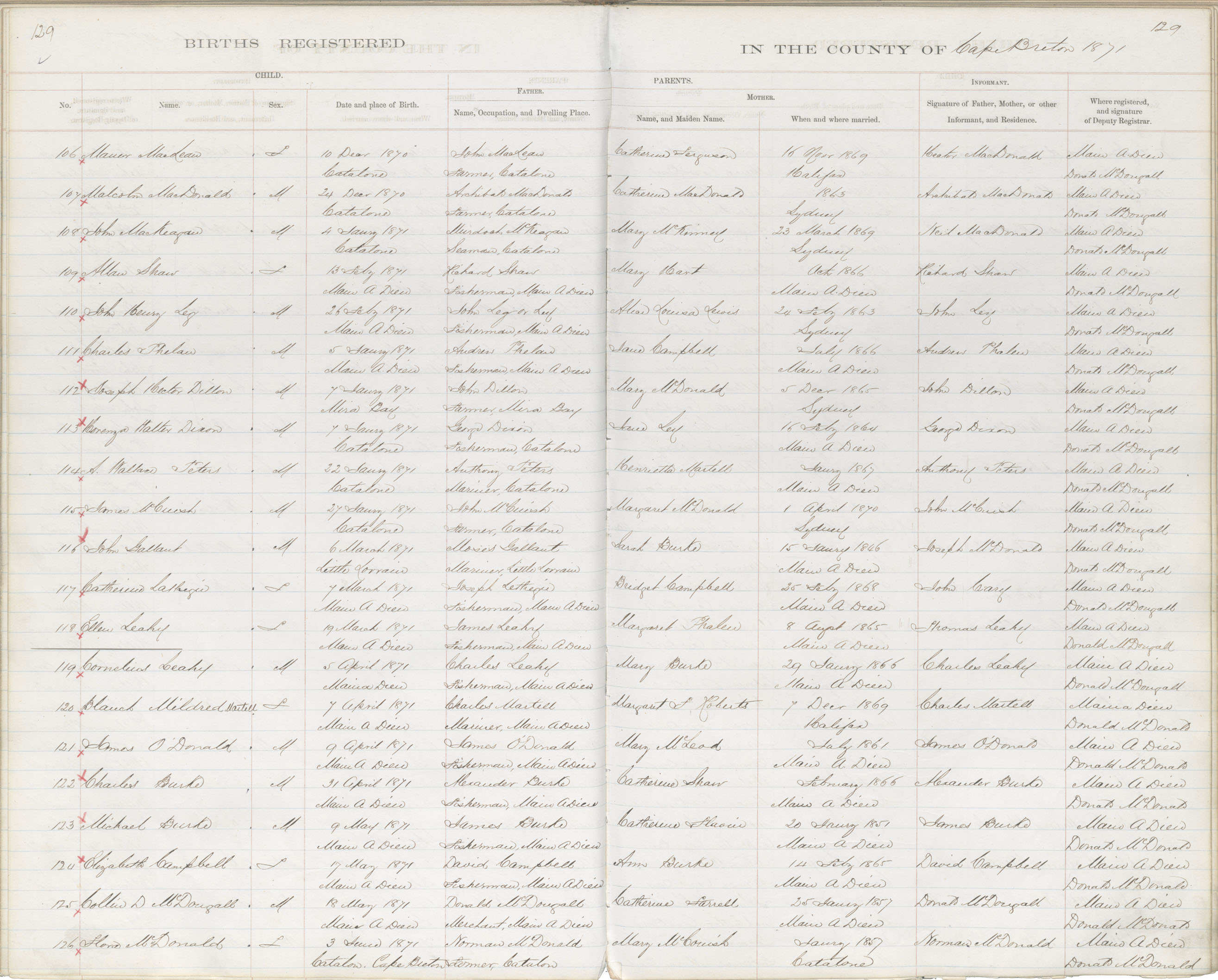 Male Birth Registration: Year: 1870 book: 1803 page: 129 number: 107