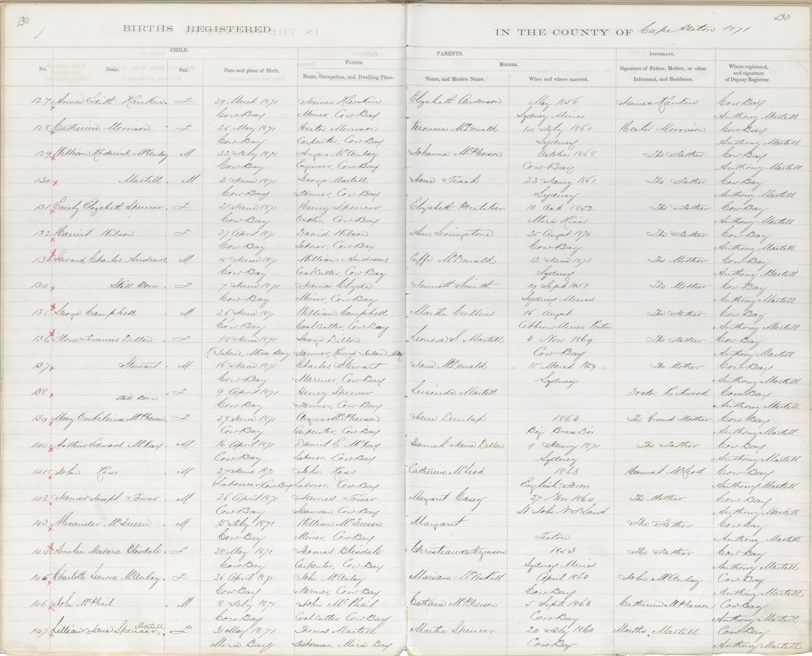 Female Birth Registration: Year: 1871 book: 1803 page: 130 number: 127