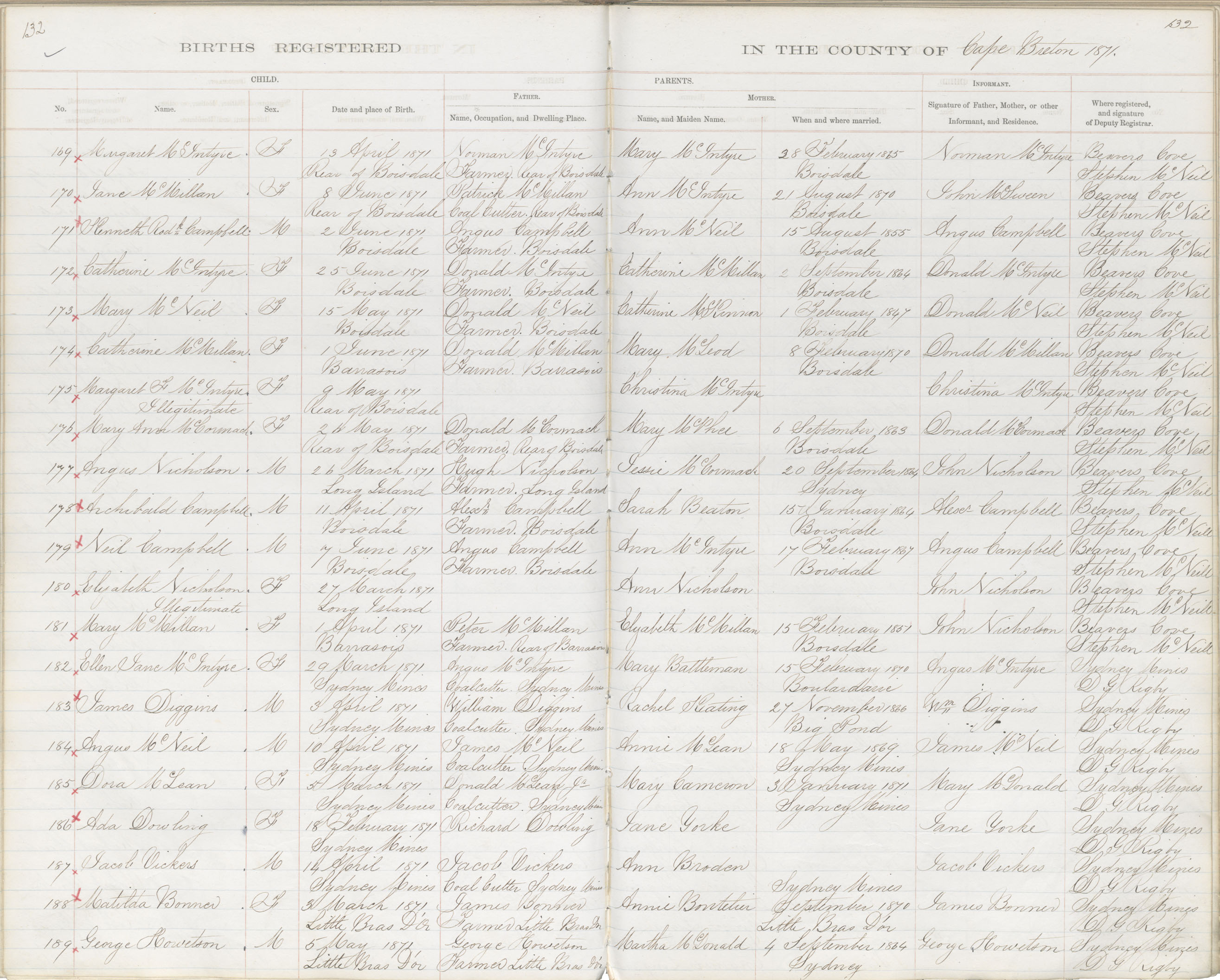 Male Birth Registration: Year: 1871 book: 1803 page: 132 number: 189