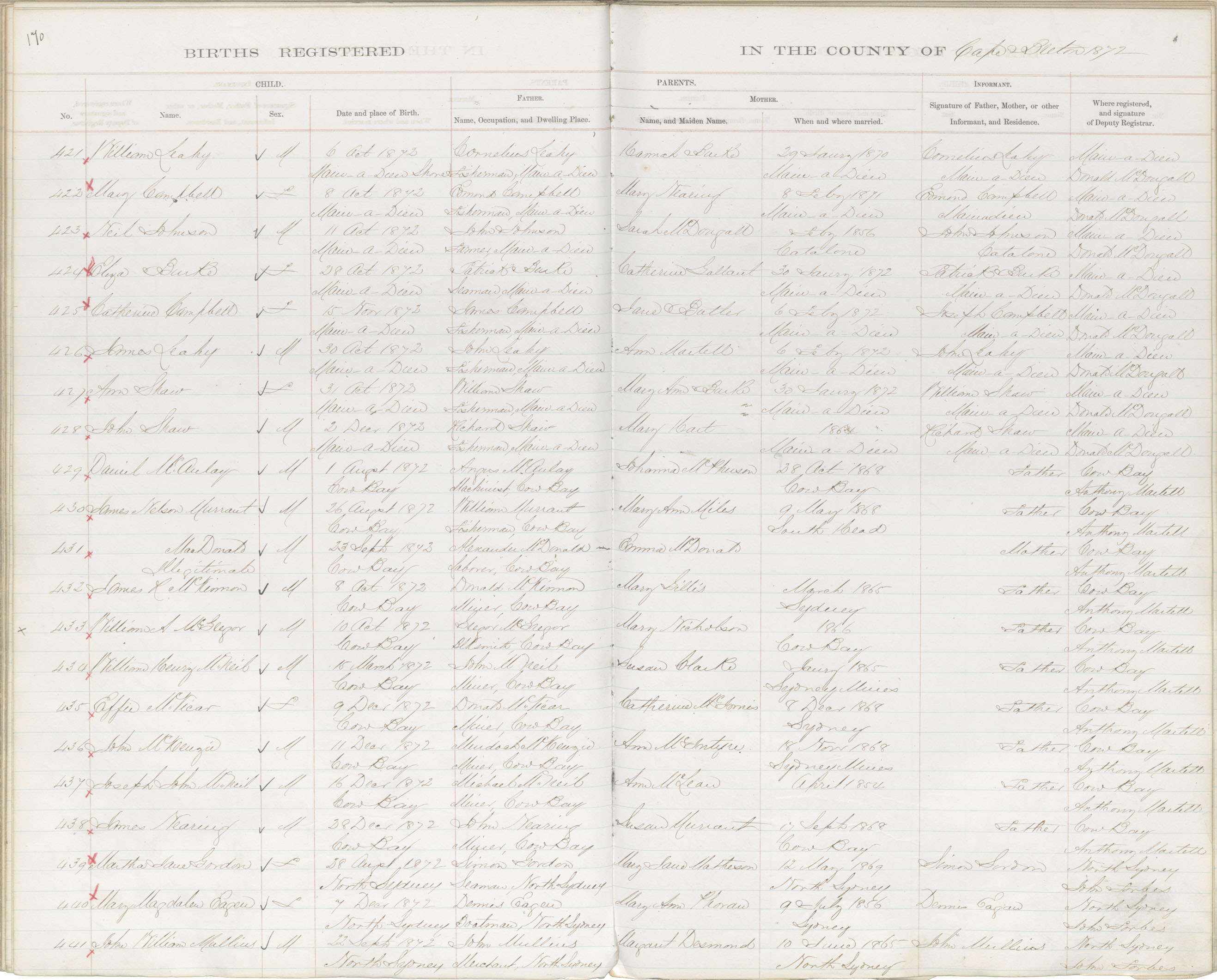 Male Birth Registration: Year: 1873 book: 1803 page: 170 number: 431