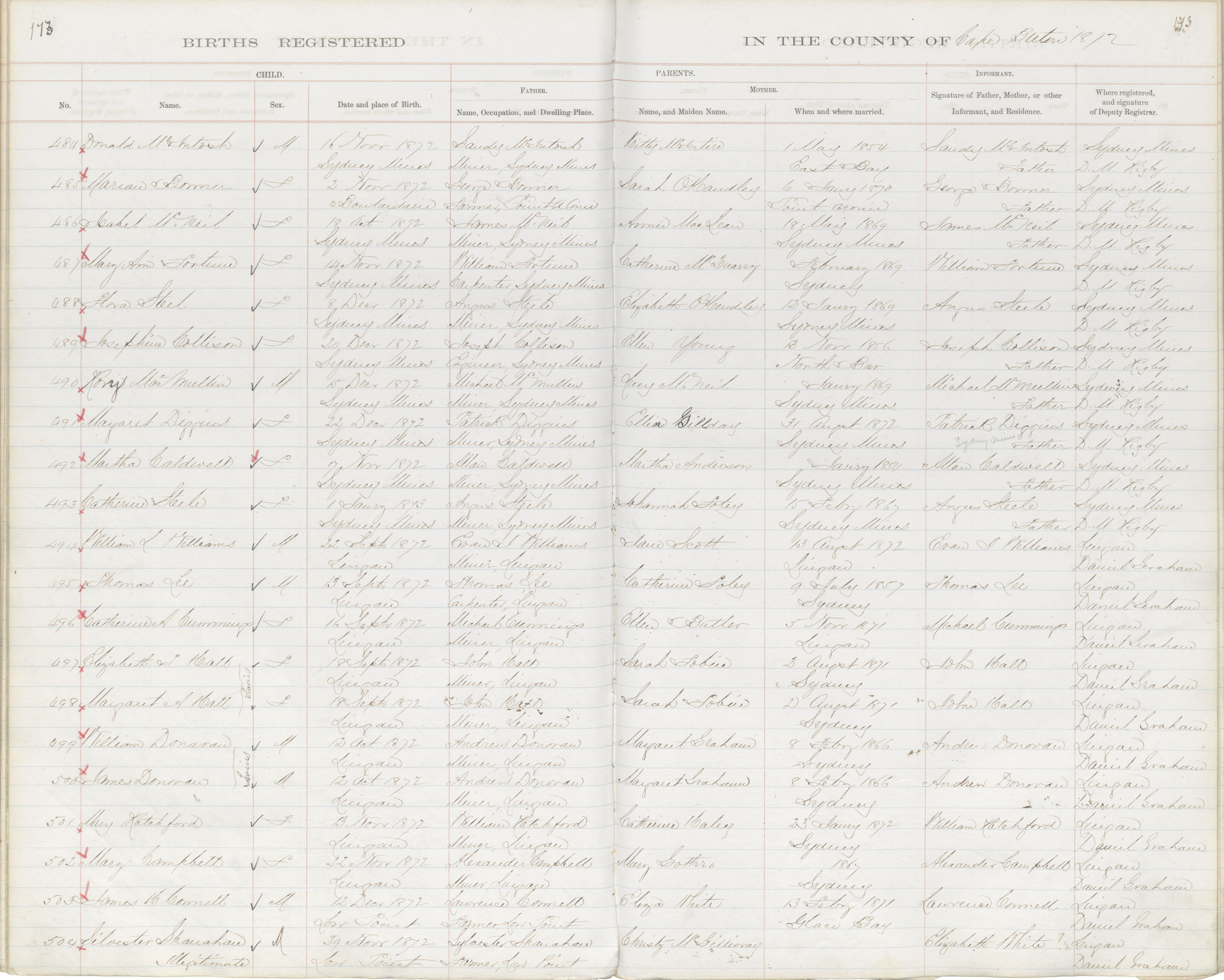 Male Birth Registration: Year: 1872 book: 1803 page: 173 number: 484
