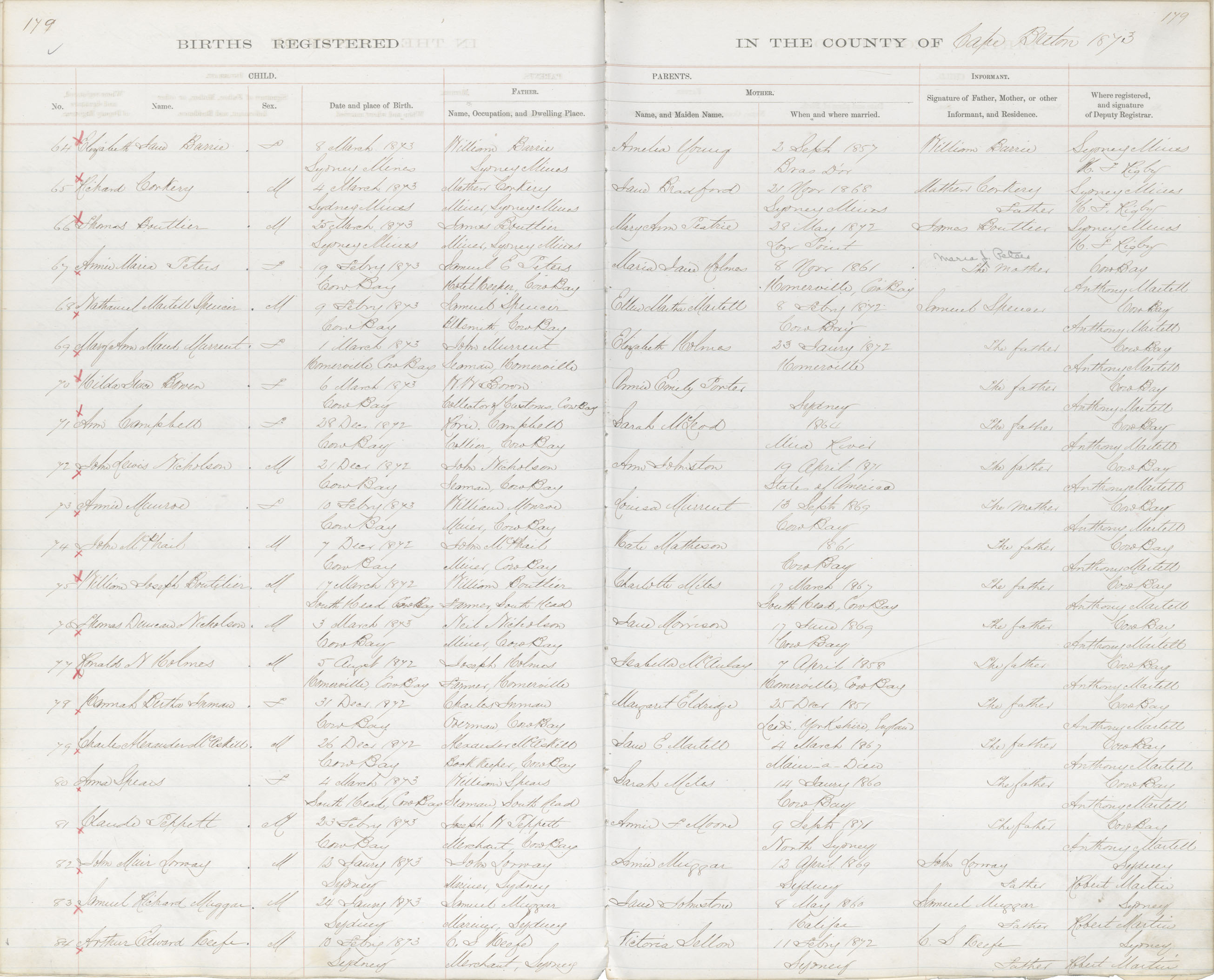 Female Birth Registration: Year: 1873 book: 1803 page: 179 number: 64