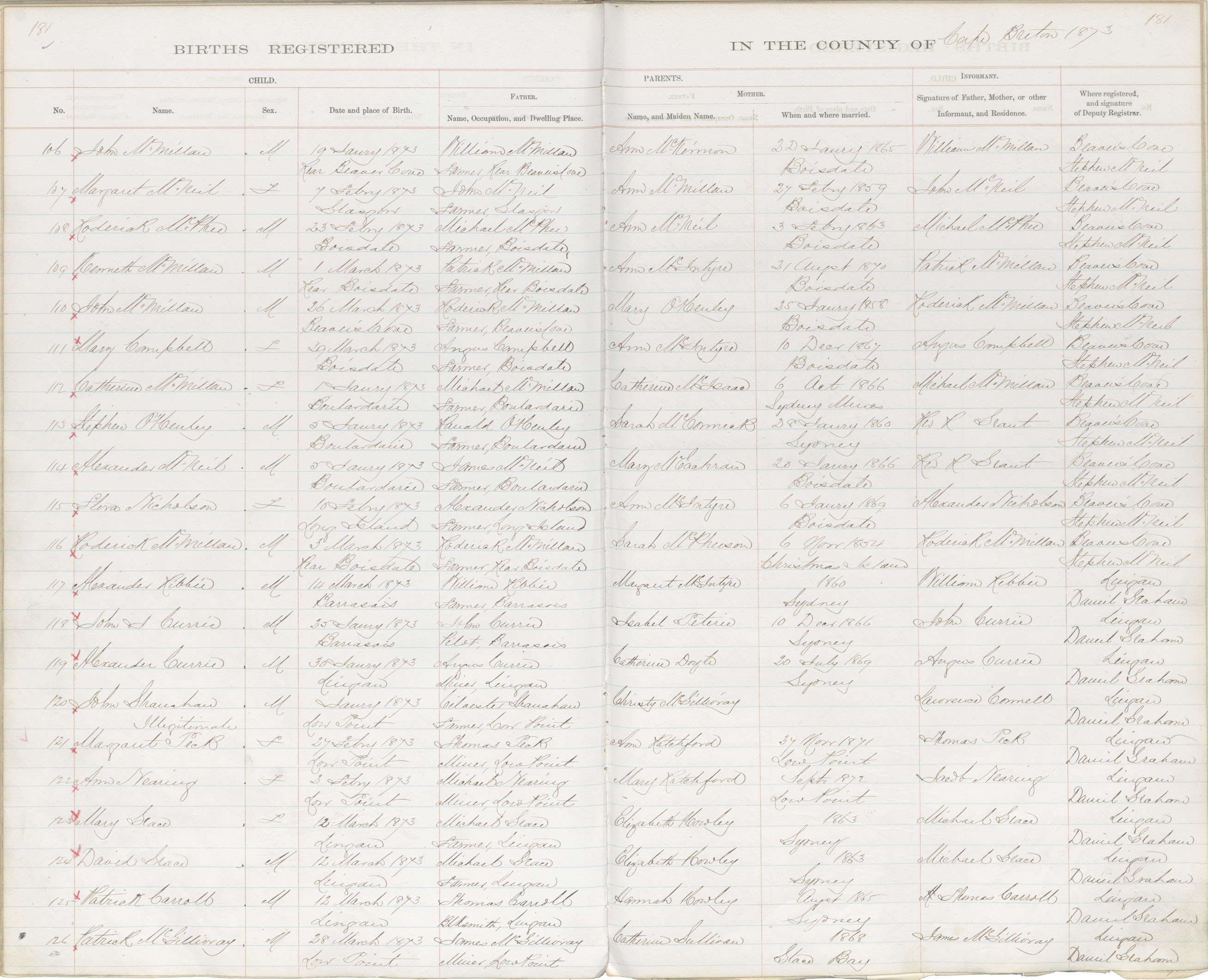 Male Birth Registration: Year: 1873 book: 1803 page: 181 number: 126
