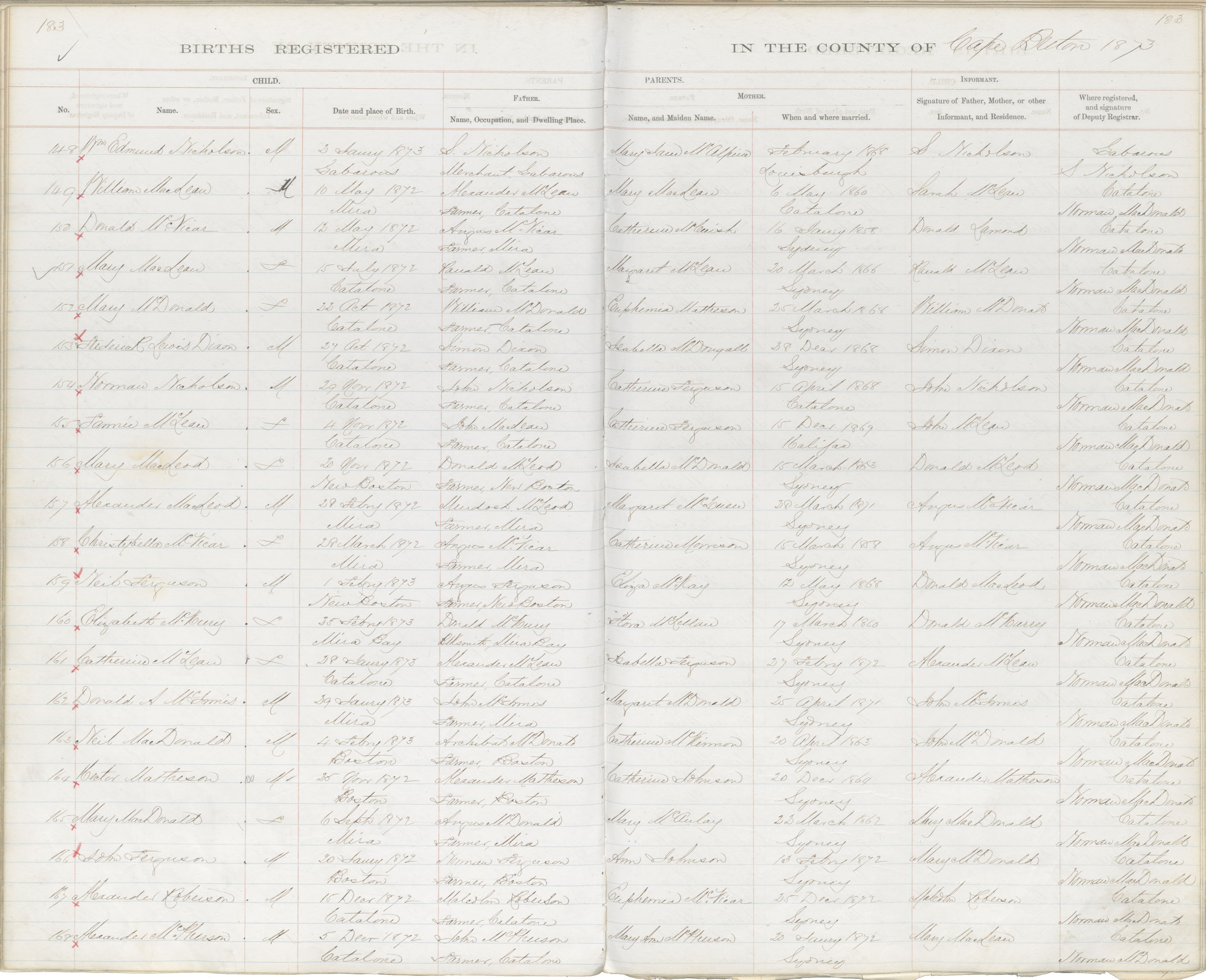 Male Birth Registration: Year: 1873 book: 1803 page: 183 number: 163
