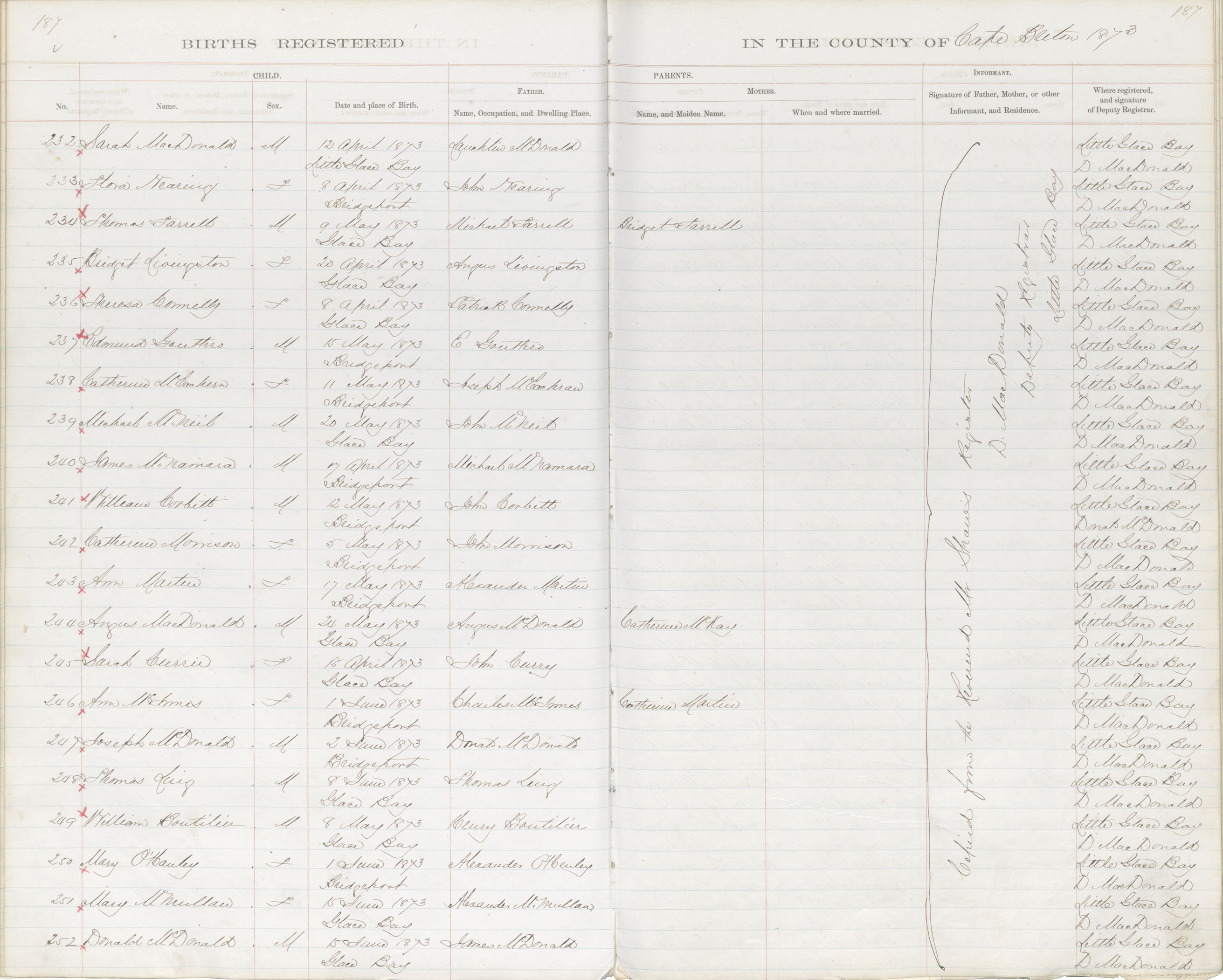 Female Birth Registration: Year: 1873 book: 1803 page: 187 number: 232