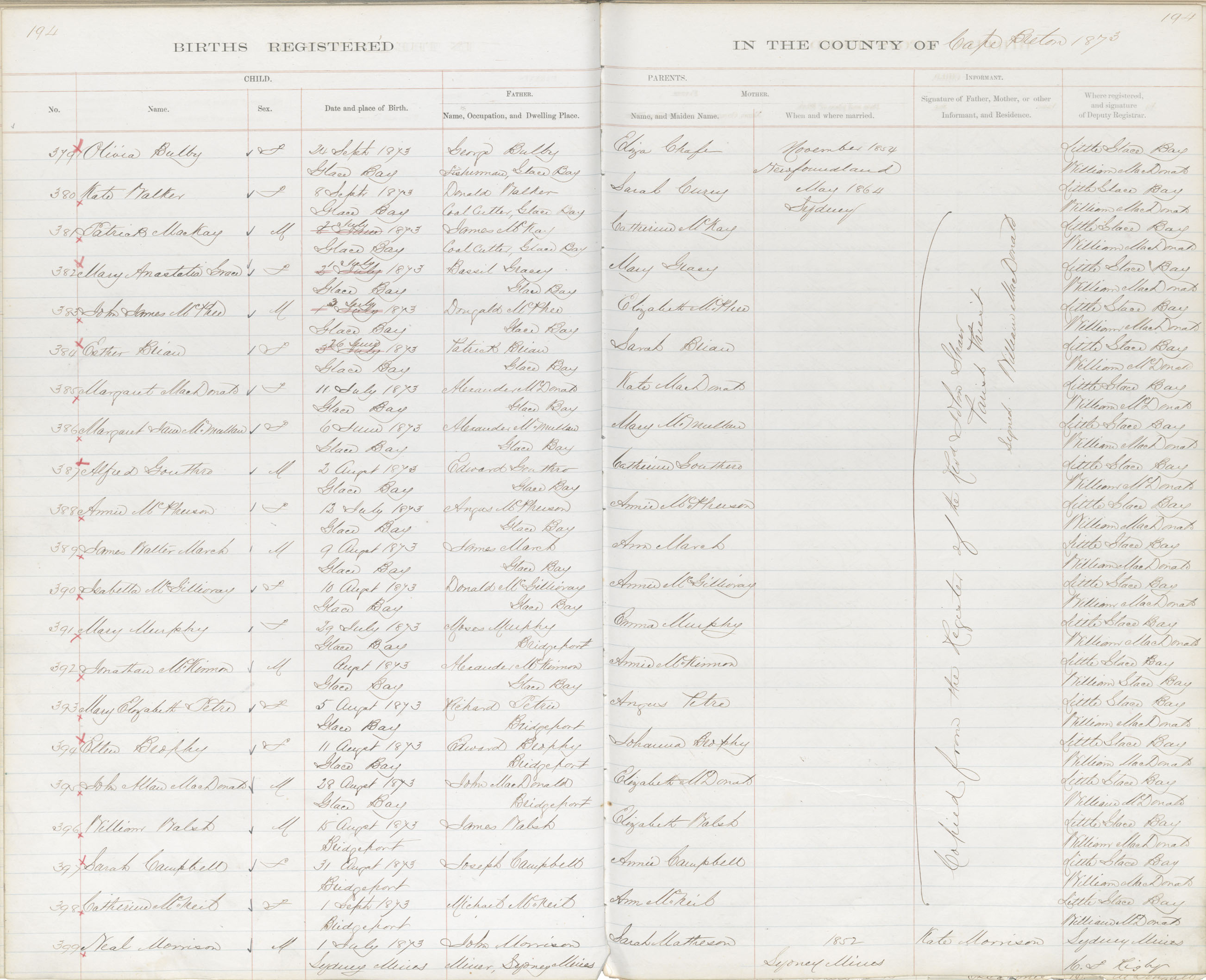 Male Birth Registration: Year: 1873 book: 1803 page: 194 number: 395