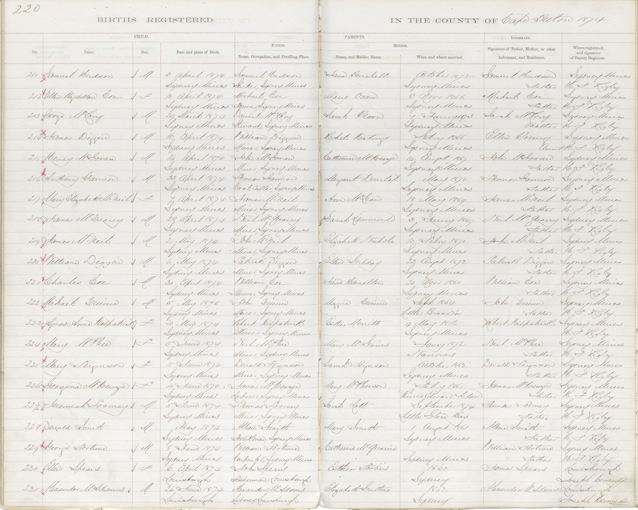 Male Birth Registration: Year: 1874 book: 1803 page: 220 number: 211