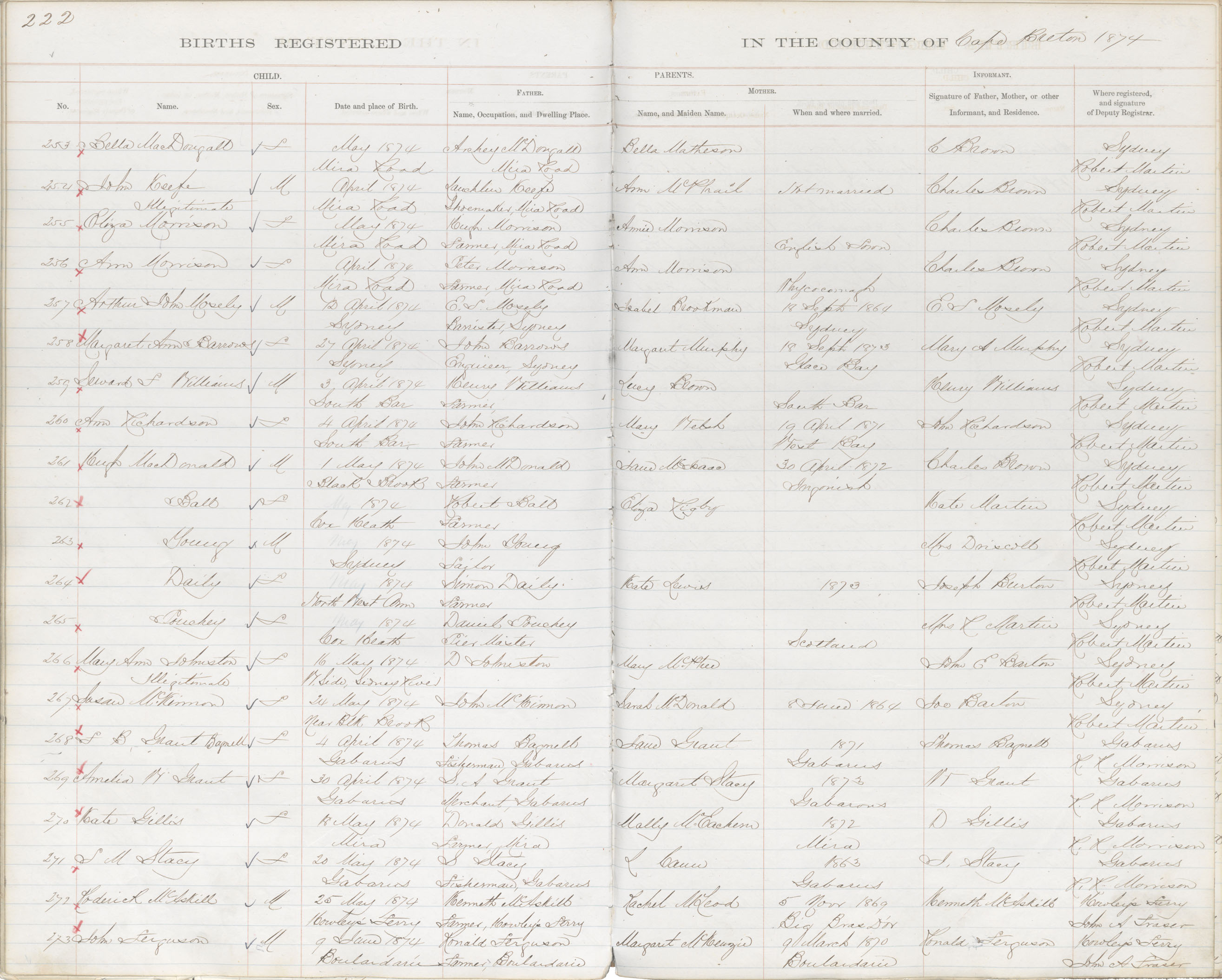 Female Birth Registration: Year: 1874 book: 1803 page: 222 number: 255