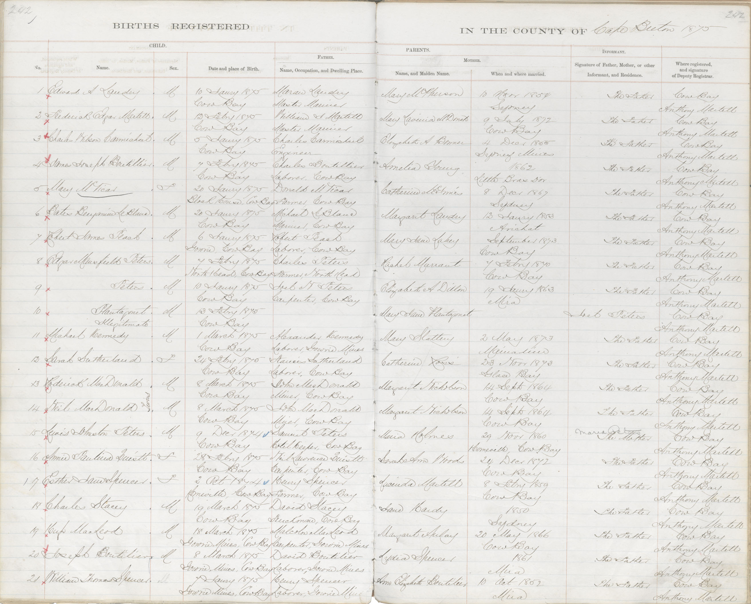 Male Birth Registration: Year: 1875 book: 1803 page: 242 number: 14