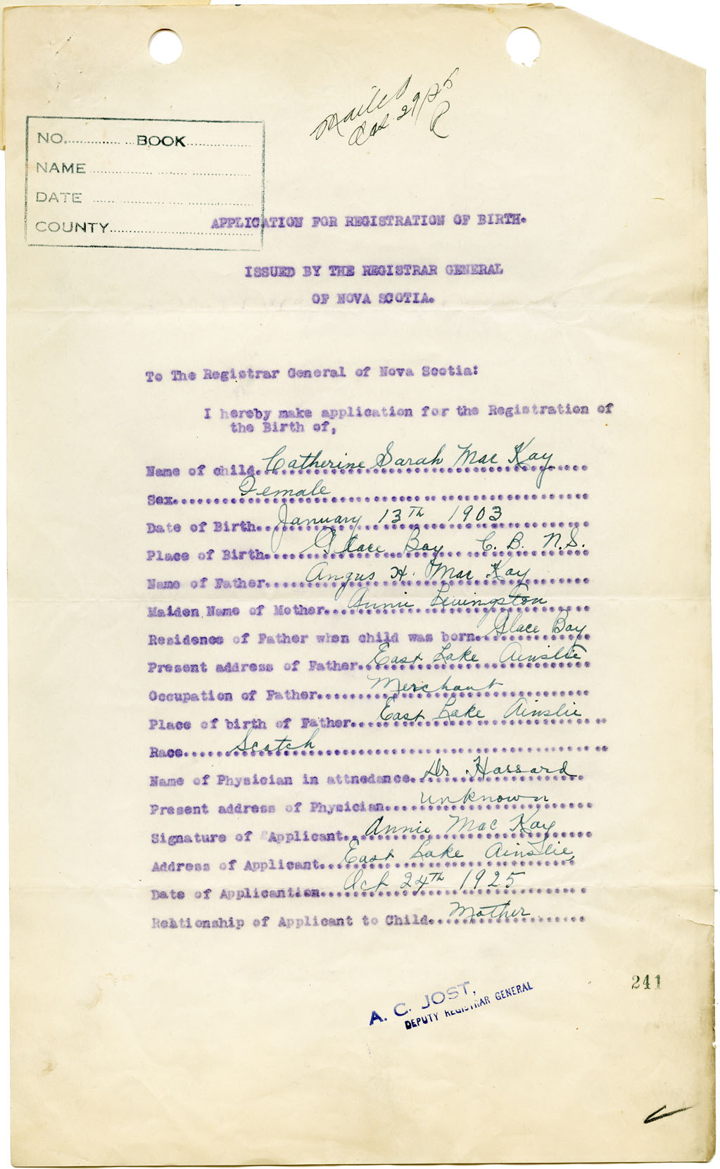 Female Birth Registration: Year: 1903 number: 93300241