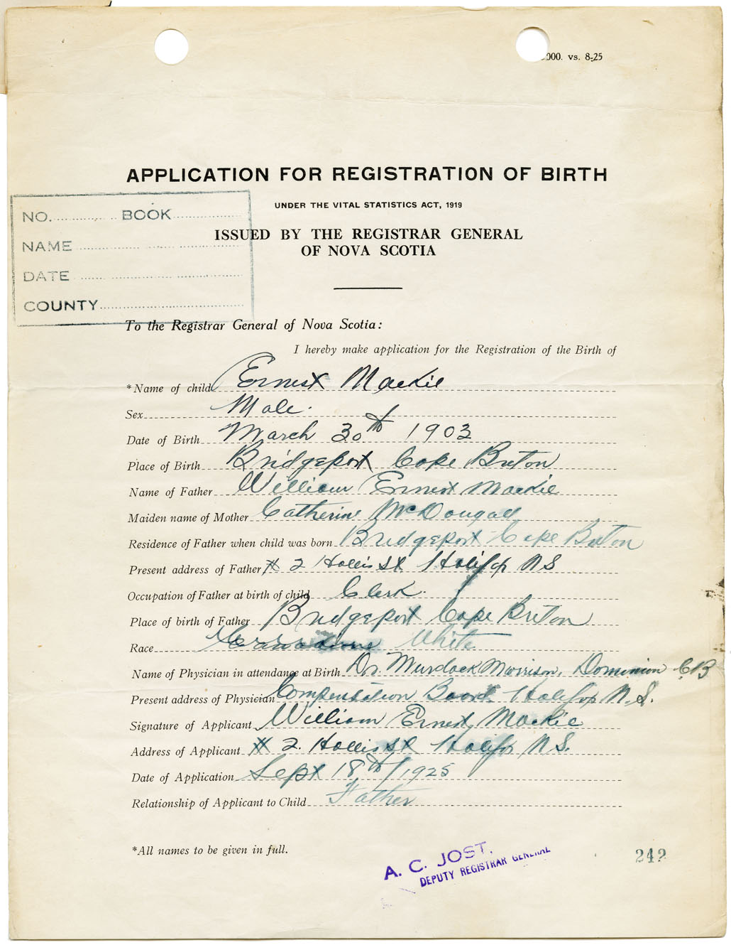 Male Birth Registration: Year: 1903 number: 93300242