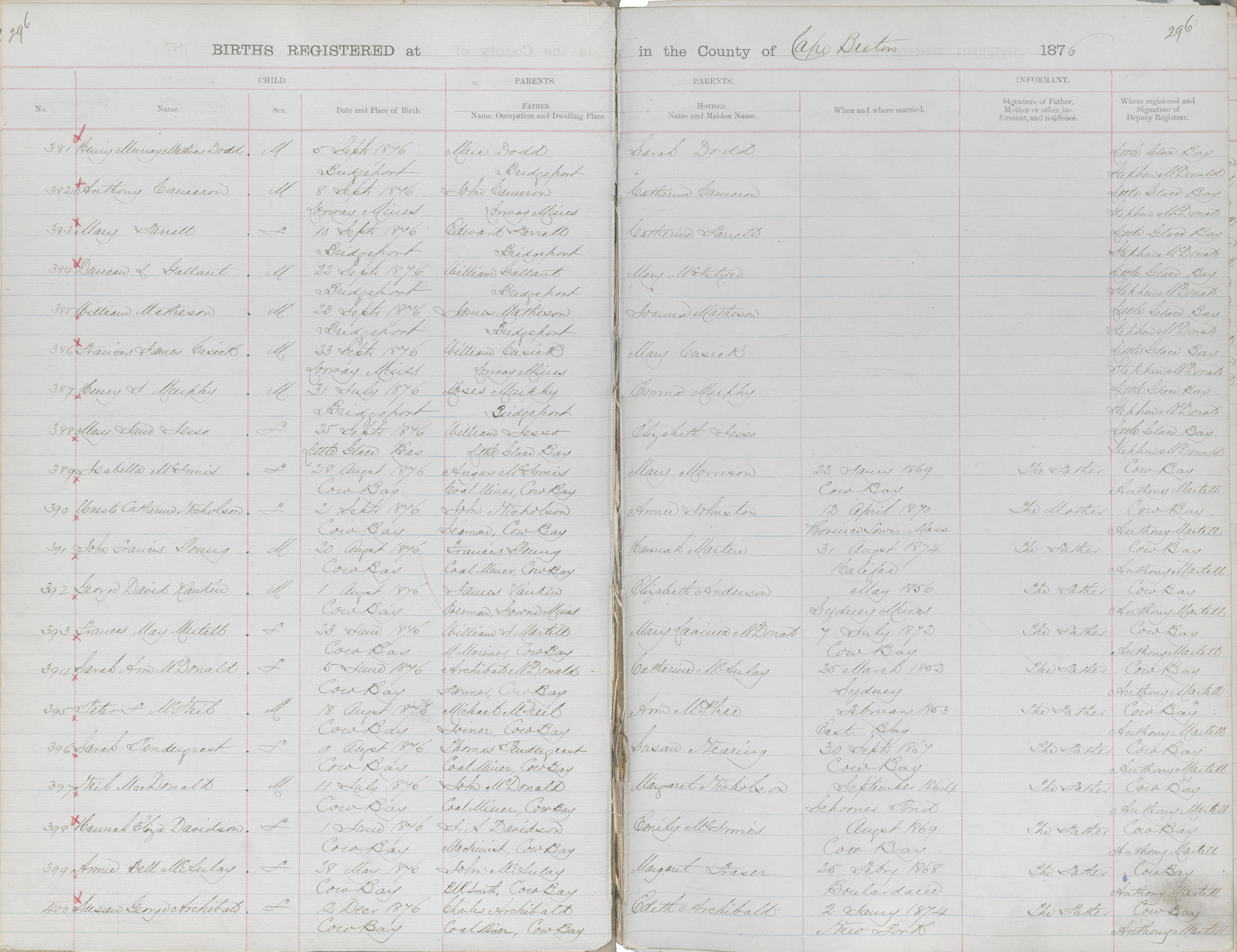 Female Birth Registration: Year: 1876 book: 1803 page: 296 number: 394