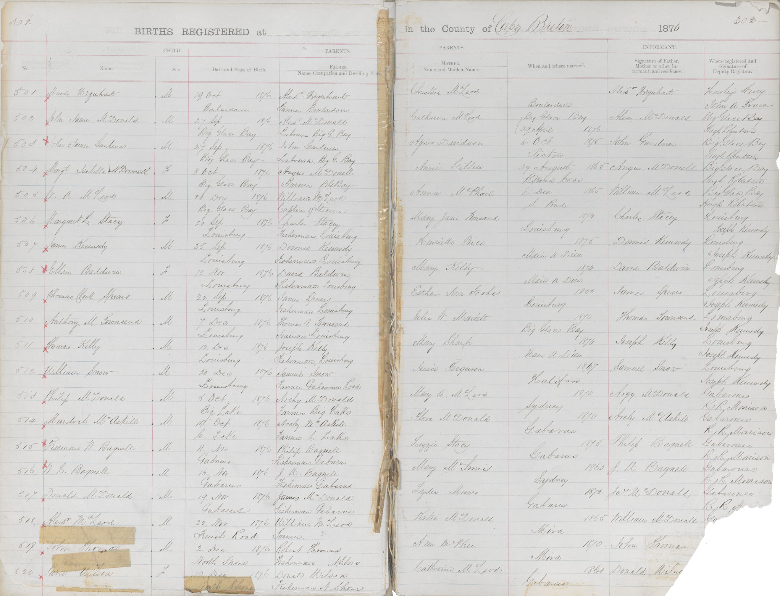 Male Birth Registration: Year: 1876 book: 1803 page: 302 number: 502