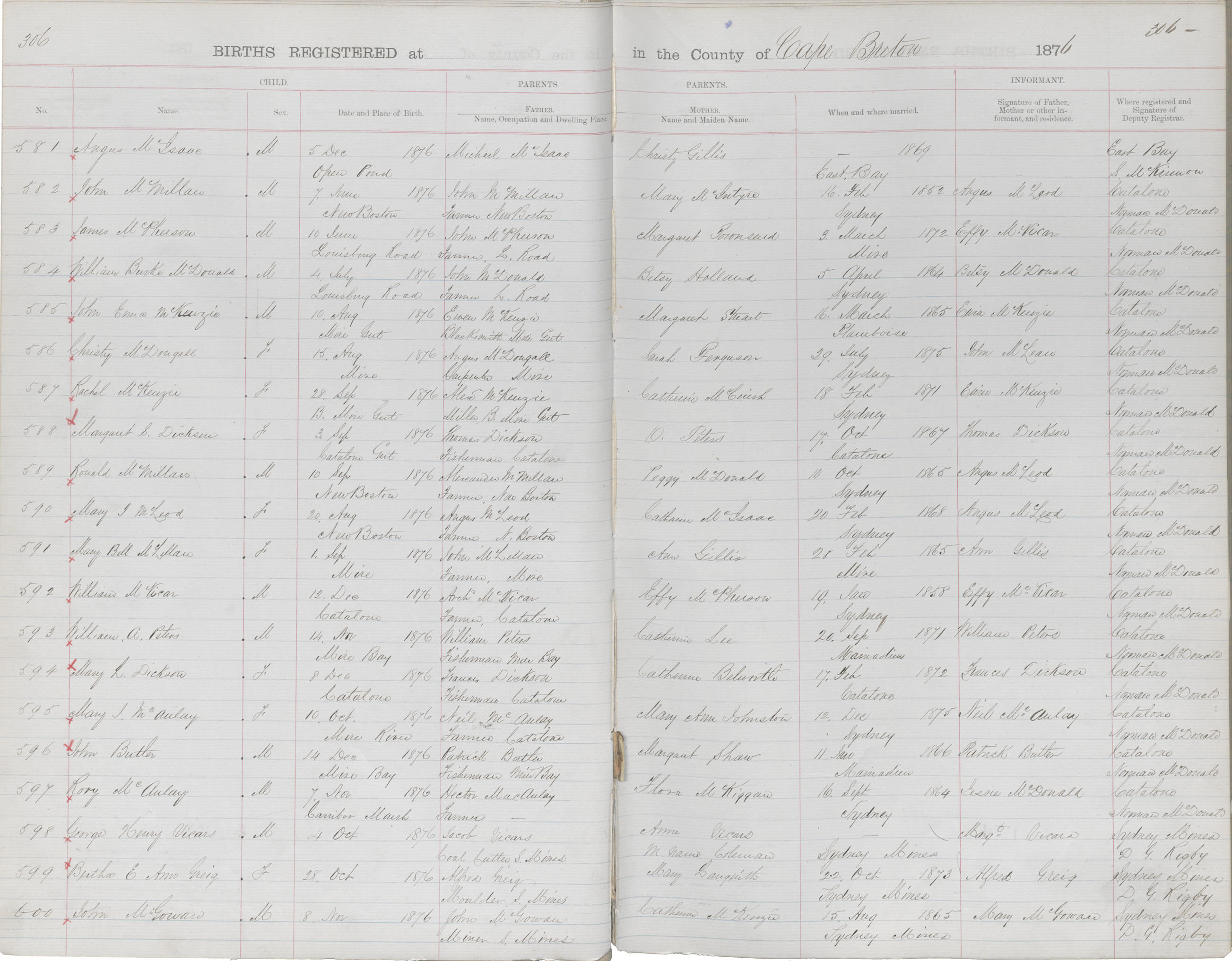 Male Birth Registration: Year: 1876 book: 1803 page: 306 number: 584