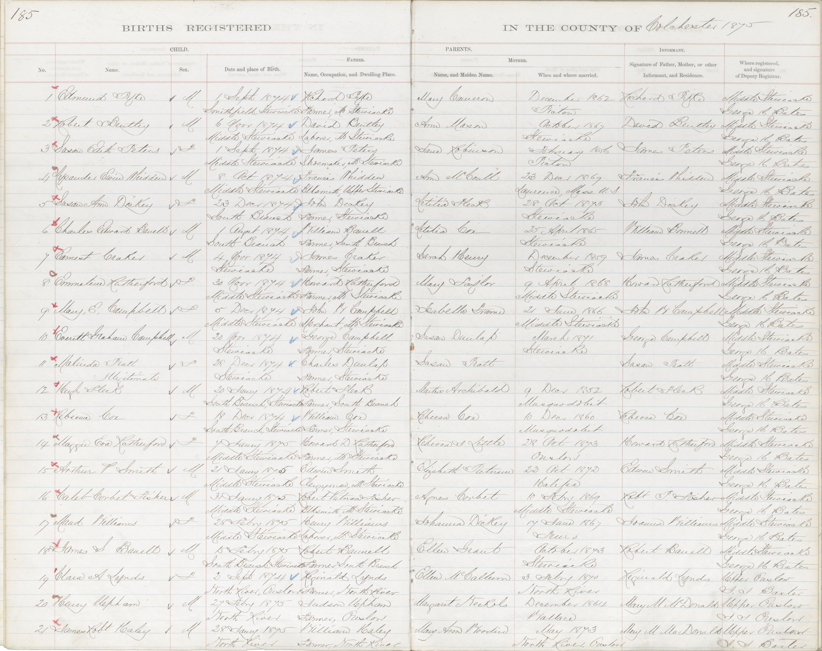 Birth Registration: Year: 1875 book: 1804 page: 185 number: 21