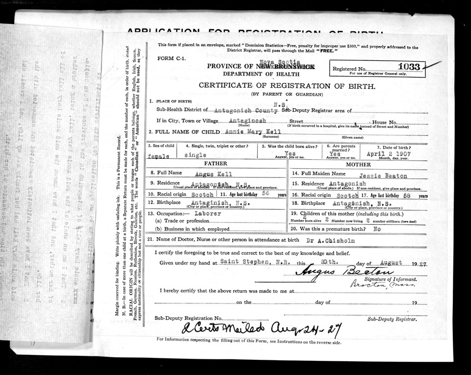 Birth Registration: Year: 1907 number: 69100033