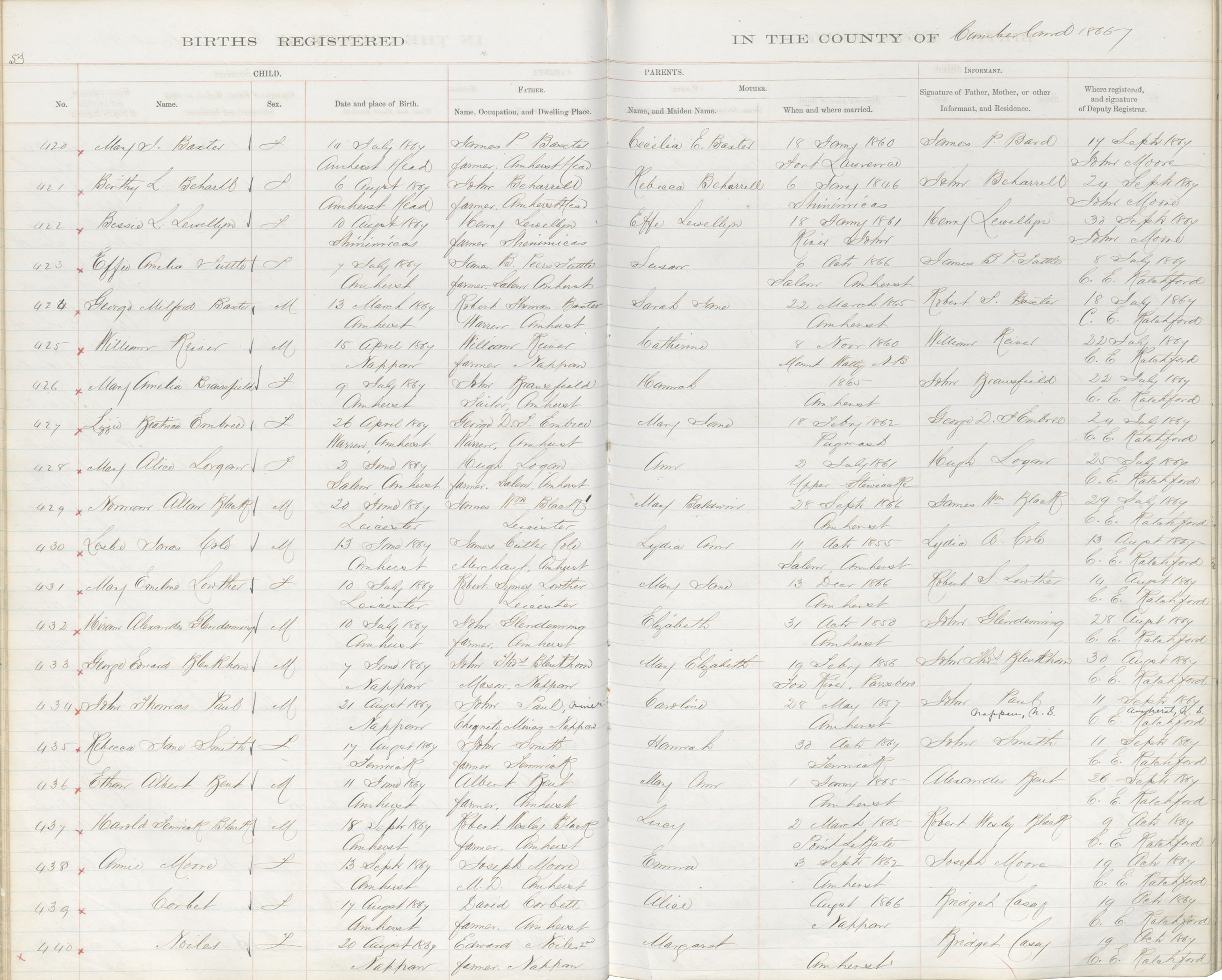 Female Birth Registration: Year: 1867 book: 1805 page: 53 number: 440