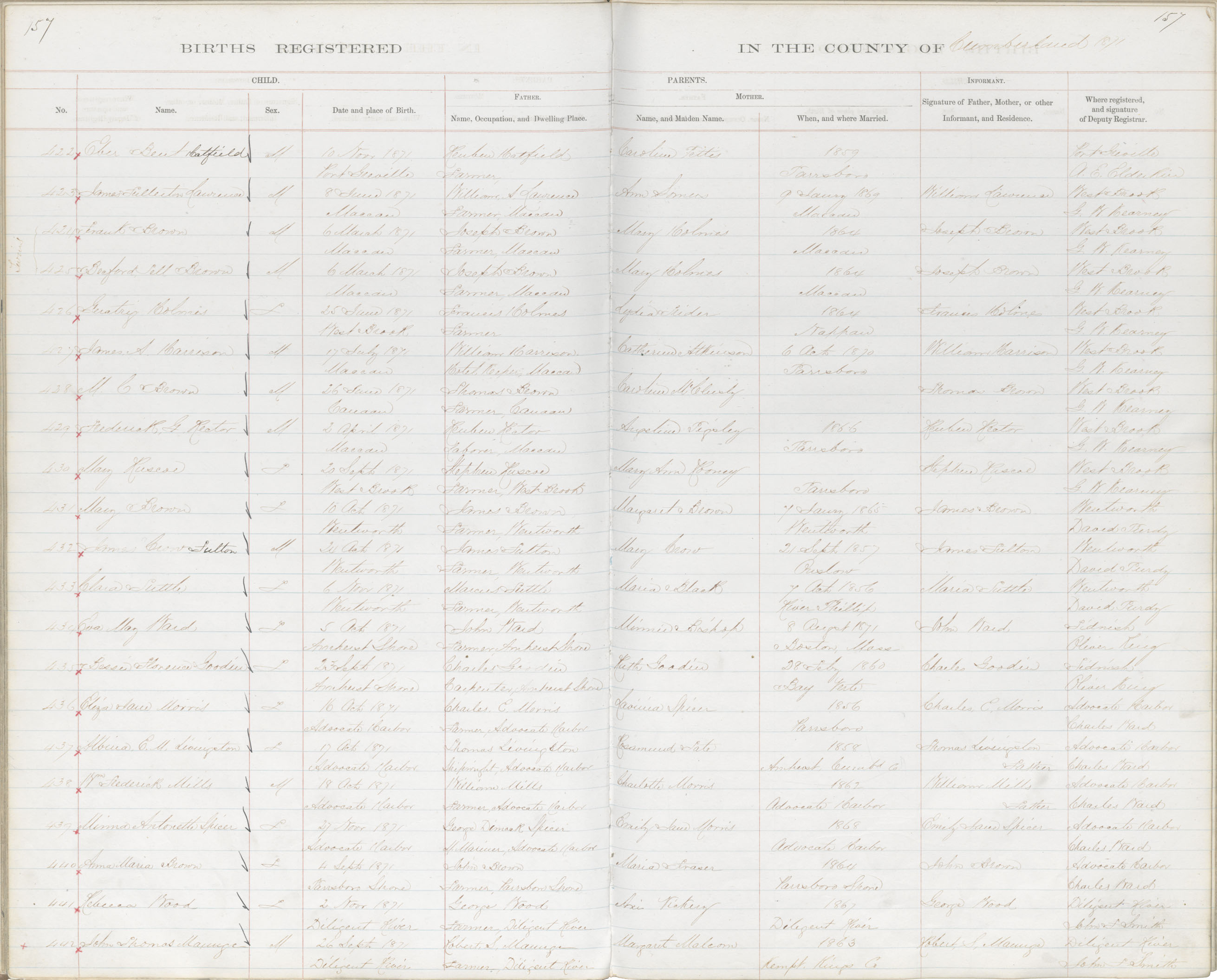 Birth Registration: Year: 1871 book: 1805 page: 157 number: 422