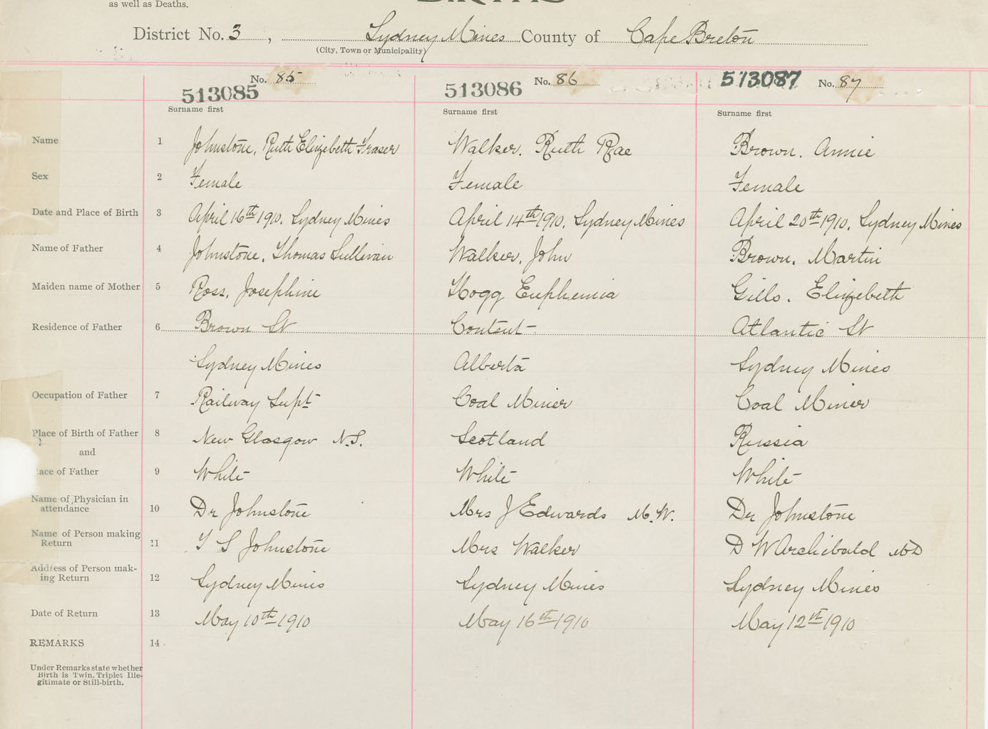 Female Birth Registration: Year: 1910 number: 51300085