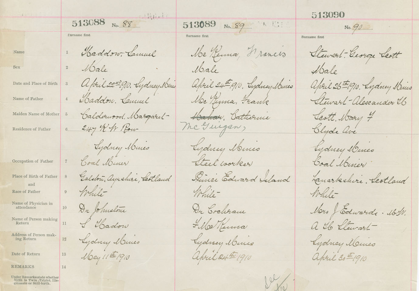 Male Birth Registration: Year: 1910 number: 51300088