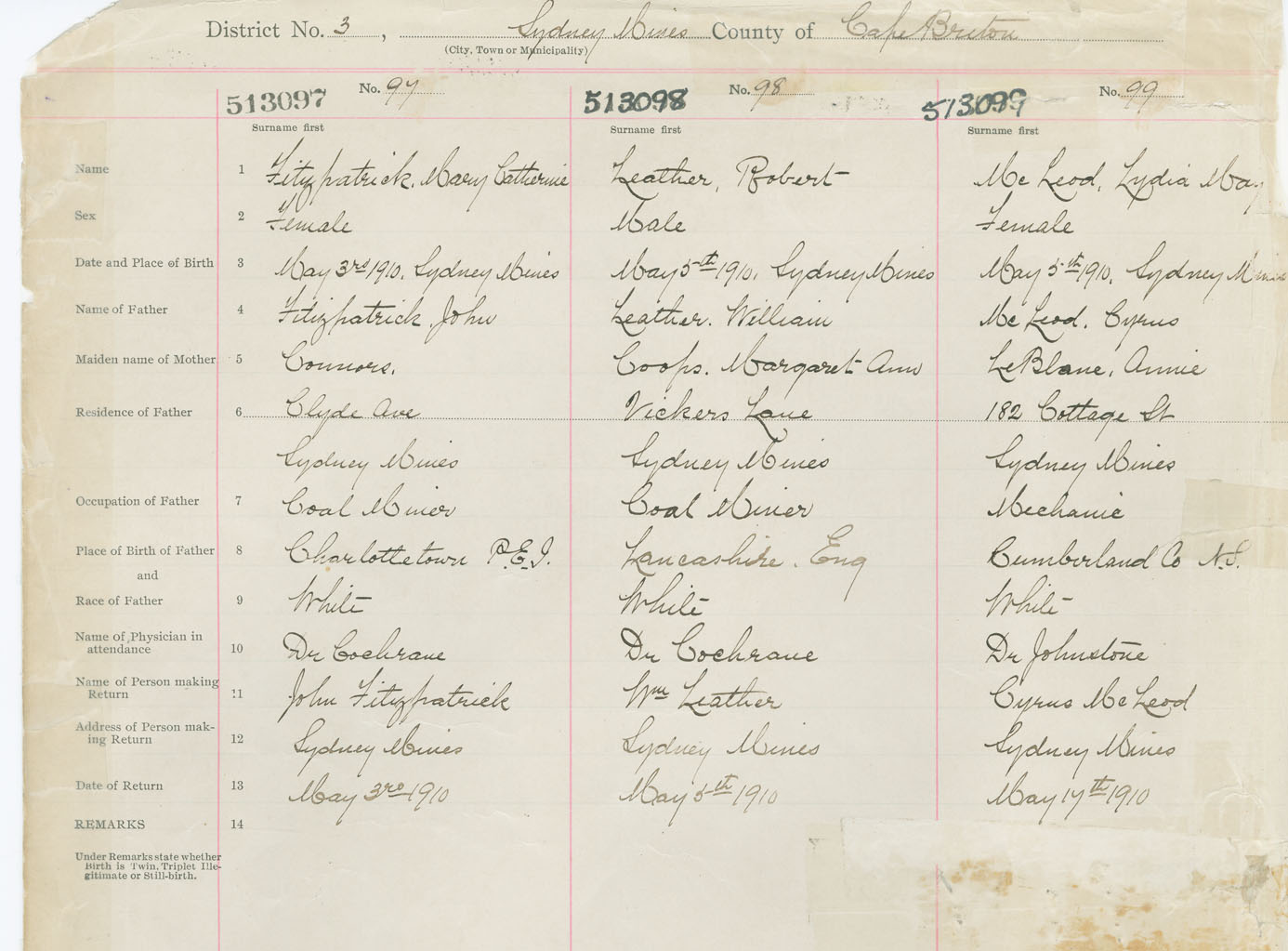 Female Birth Registration: Year: 1910 number: 51300097