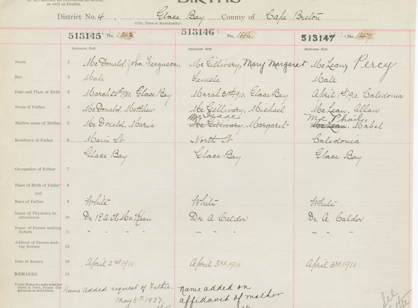 Male Birth Registration: Year: 1910 number: 51300145