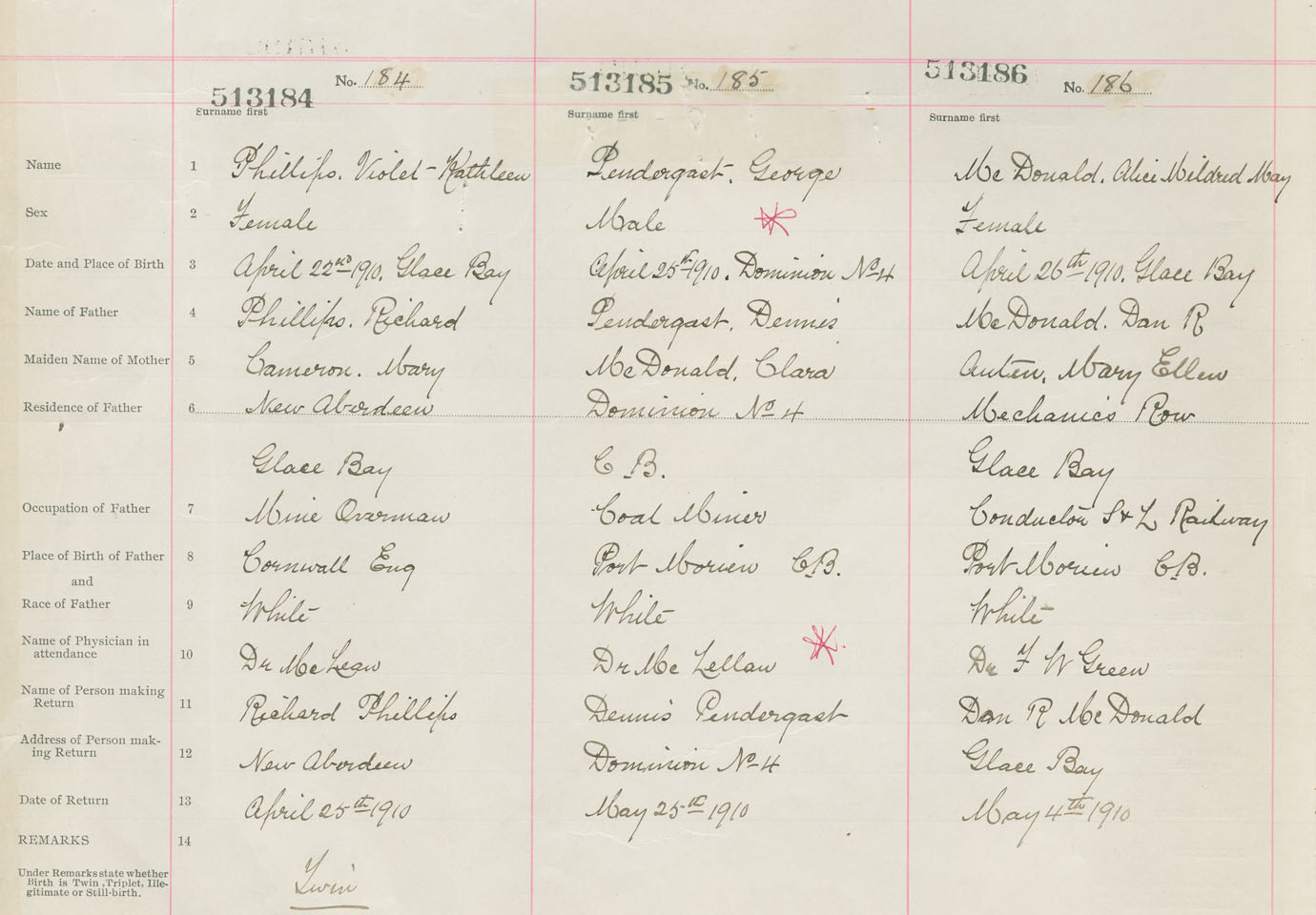 Female Birth Registration: Year: 1910 number: 51300186