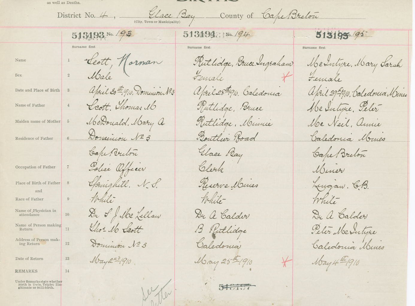 Female Birth Registration: Year: 1910 number: 51300195