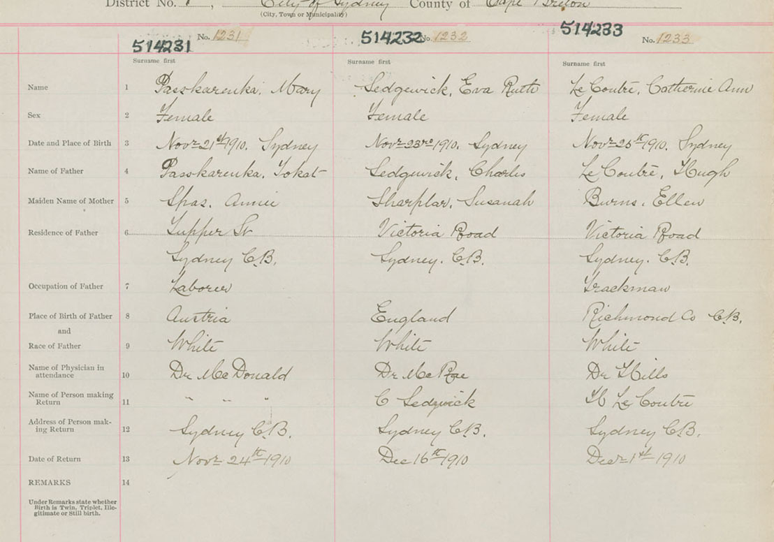 Female Birth Registration: Year: 1910 number: 51400233