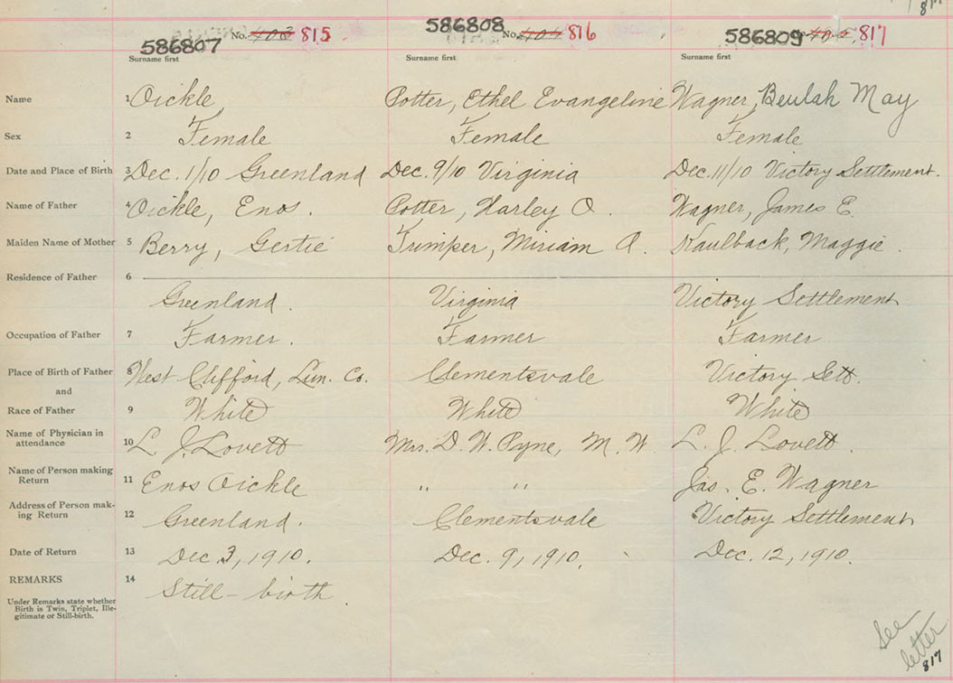Female Birth Registration: Year: 1910 number: 58600807