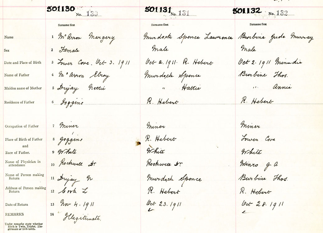 Female Birth Registration: Year: 1911 number: 50100130