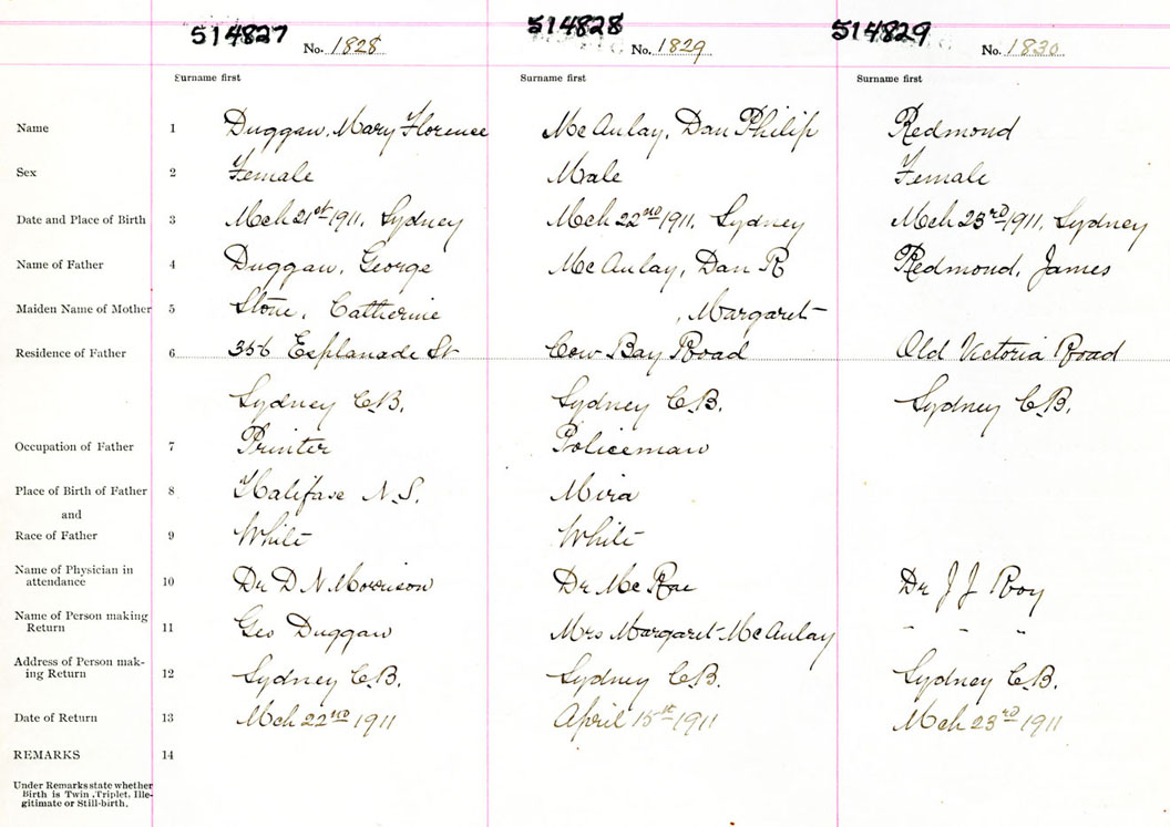 Female Birth Registration: Year: 1911 number: 51400827