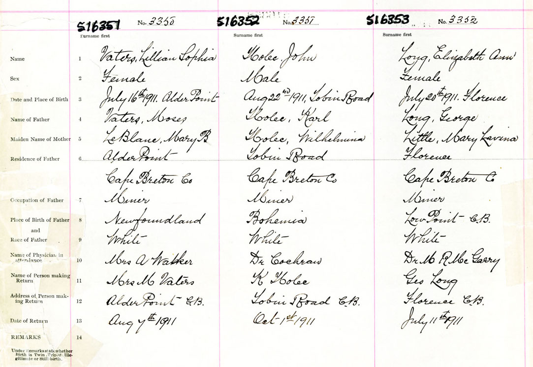 Female Birth Registration: Year: 1911 number: 51600351